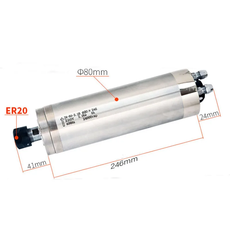 Model number: JR-80-2.2B Size: 80mm×246mm Cooling type: water cooling Output power: 2.2KW Voltage: 220V Current: 8.0A Rated frequency: 400Hz Rotationspeed:24000rpm/min Tool holder specification: ER20 Lubrication method: grease lubrication weight: 6.2kg water pipe specification: inner 5 outer 8