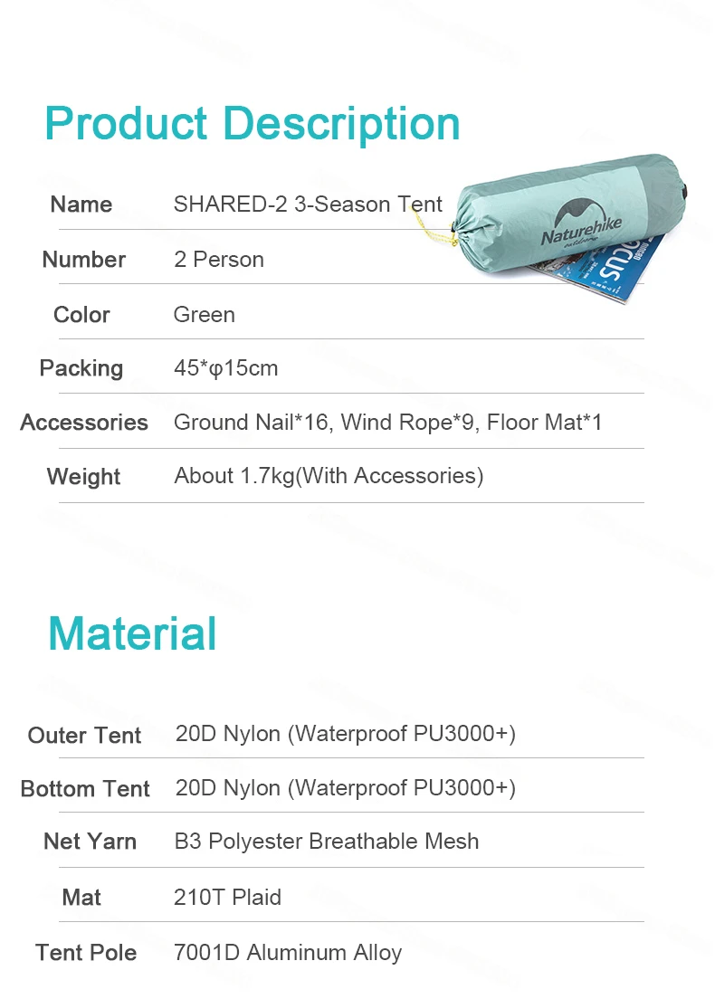 Упаковочный лист: Ремешок/внешний мешок/Внутренняя палатка/внешняя палатка/шатер Полюс/наземный Nailx16/Ветер Ropex9/Бесплатный напольный коврик