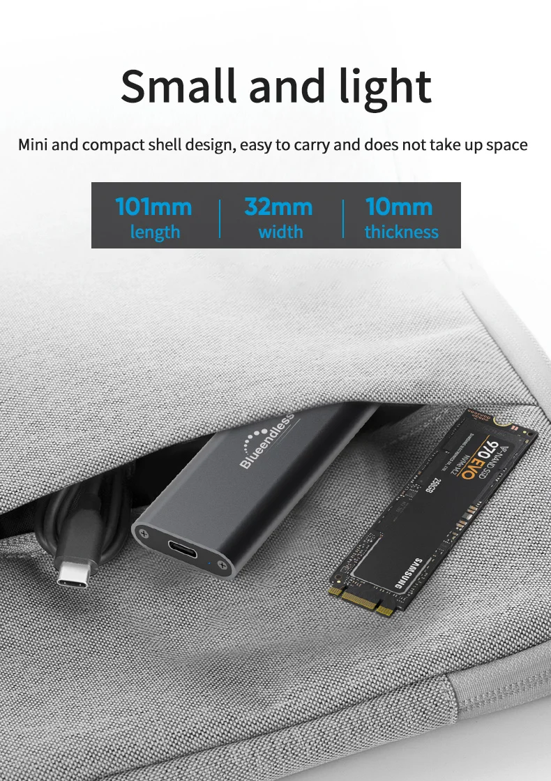 Размер SSD: 101 мм * 30 мм * 11 мм, емкость 2 ТБ, с кабелем типа C-USB A, максимальная скорость: 10 Гбит/с.