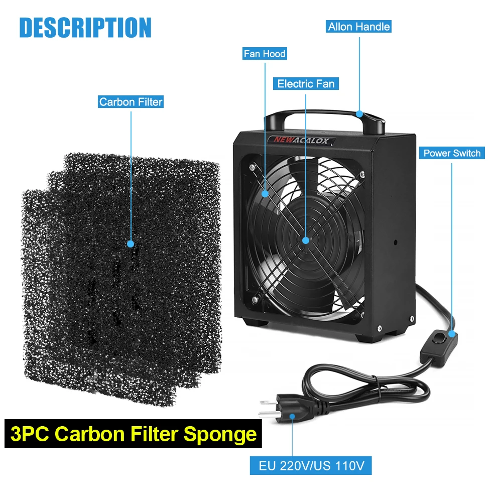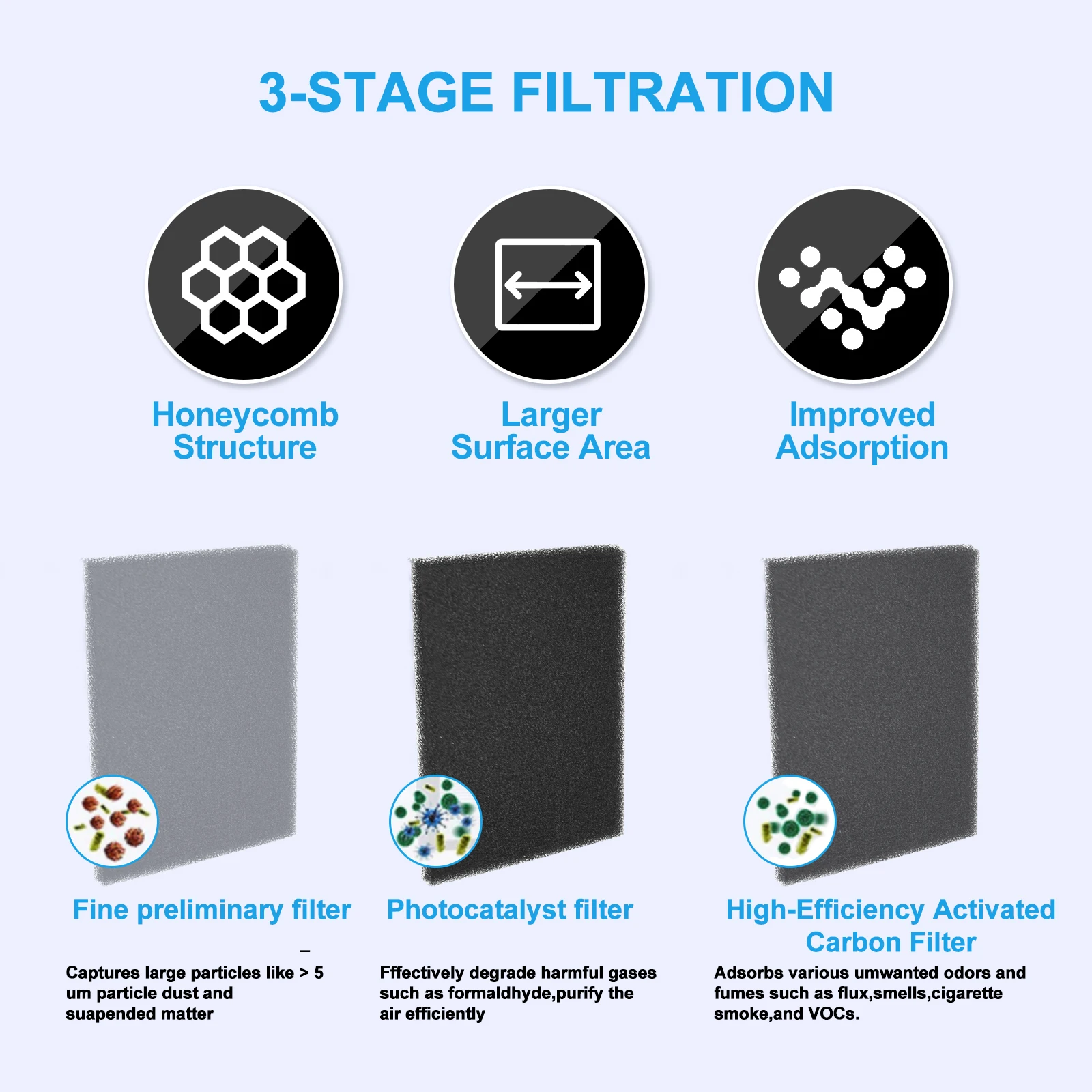 1. Низкая Шум вентилятор с дымовой фильтр: защитой от статического электричества Дыма вытяжной вентилятор с 0,4 дюйма толщиной фильтр из активированного угля может извлечь от припой, флюс, химических веществ, газов или других вредных веществ в дыма припоя, И очищен фильтрующей сеткой с активированным углем. Рекомендуемая замена фильтра каждые 4-5 месяцев в зависимости от использования.