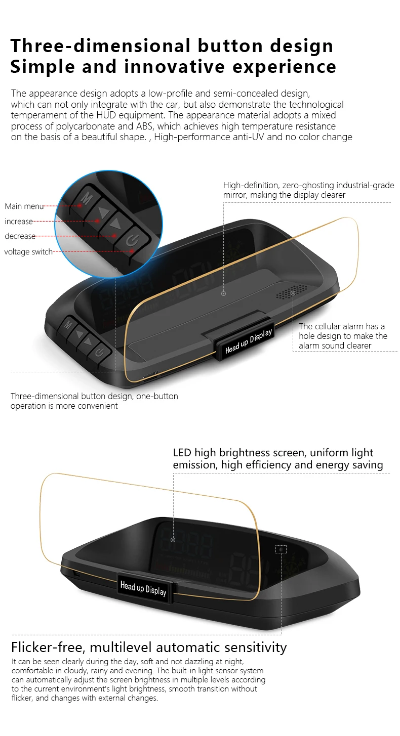 Название бренда: технология DATONG Происхождение: CN (происхождение) Провод или беспроводной: проводной Название размера: 135x68x56мм Выходная частота: DC12V Название Ptoduct: Универсальный Автомобильный дисплей Тип: hud C5 Материал: АБС-пластик Тип изделия: системы сигнализации и безопасности Функция: сигнализация скорости, температура воды, об/мин, усталость Марка автомобиля: OBD2 или ЕС OBD интерфейс Сертификация: CE,ROHS,FCC