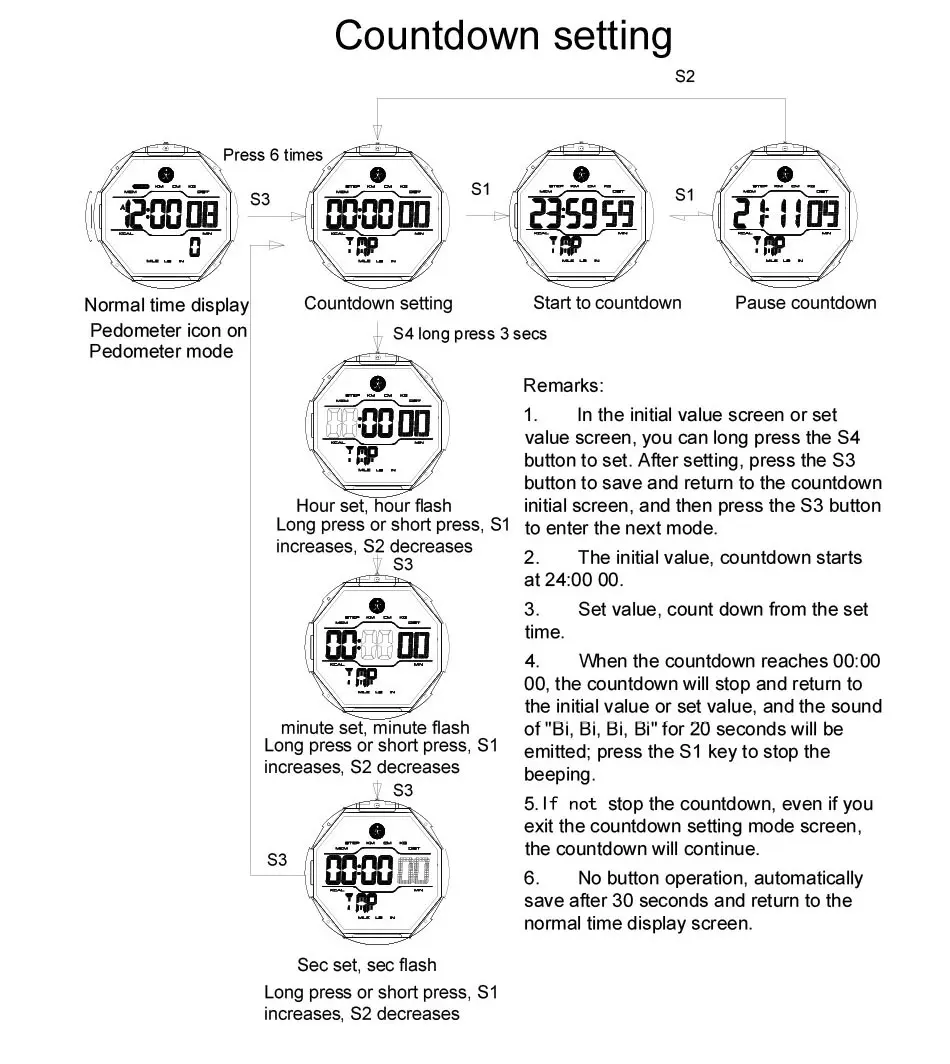 1. На экране initialvalue или на экране set value можно нажать и удерживать кнопку S4 для установки. После установки нажмите кнопку S3, чтобы сохранить и вернуться на Начальный экран обратного отсчета, а затем нажмите кнопку S 3, чтобы войти в следующий режим.