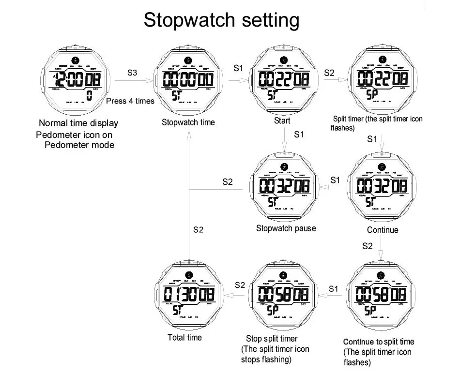 1) в дисплее отображения нормального времени нажмите и удерживайте кнопку S1 в течение 3 секунд, чтобы включить или выключить функцию ступенчатого включения; Когда включен подсчет шага, подсчет шагов срабатывает на 15 последовательных шагов, а количество шагов включено в общее количество шагов; Не будет срабатывать менее 15 последовательных шагов, а количество шагов не будет учитываться в общем количестве шагов; В процессе подсчета шагов, при отсутствии непрерывного действия или неподвижности устройство переходит в режим энергосбережения с подсчетом шагов.