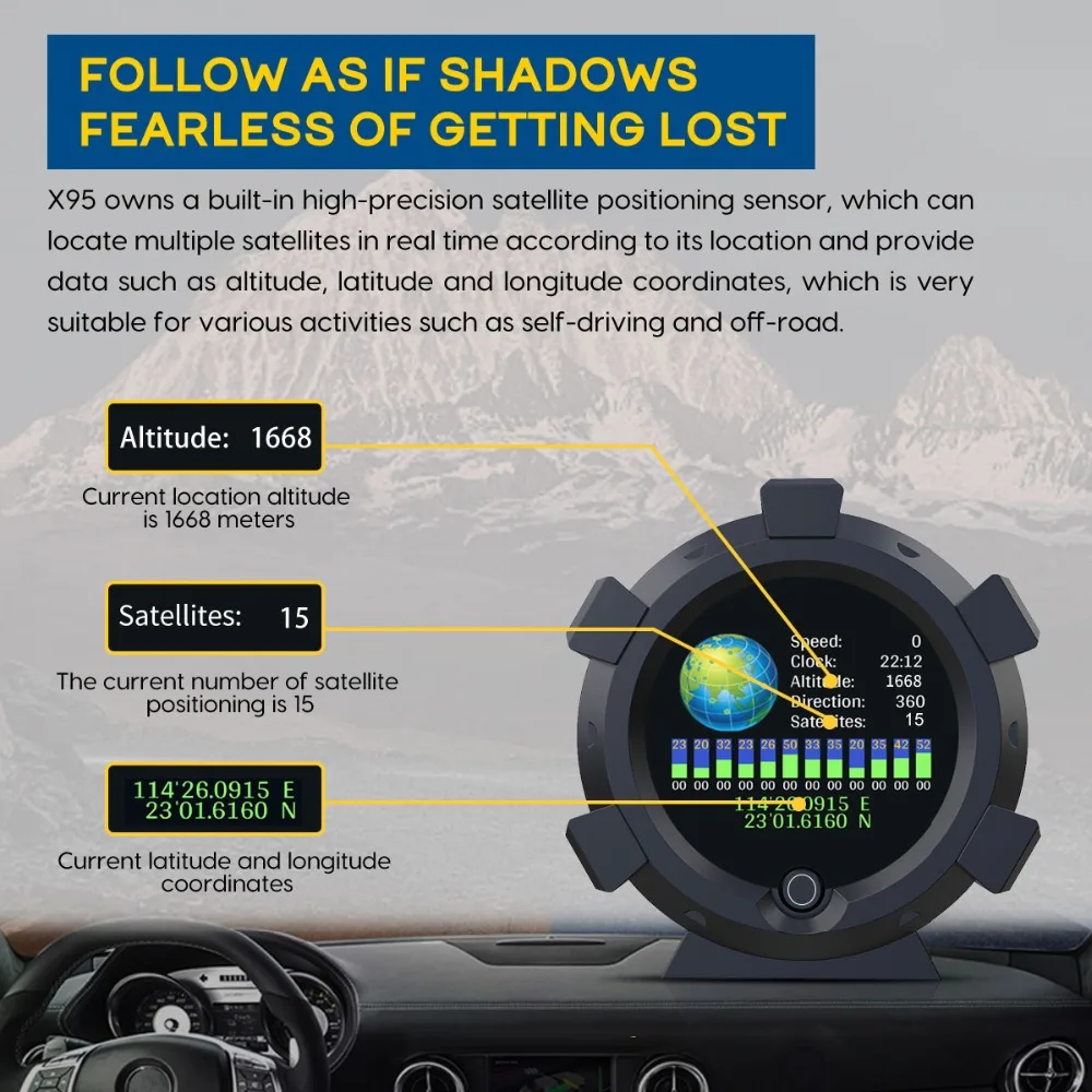 AUTOOL X95-это многофункциональный инструмент со встроенным многоосевым гироскопом и системой GPS, который может измерять наклон и наклон, степень спуска и гору внедорожных транспортных средств. Он также обеспечивает скорость транспортного средства, высоту и направление движения транспортного средства и имеет высокоточную спутниковую функцию в режиме реального времени.