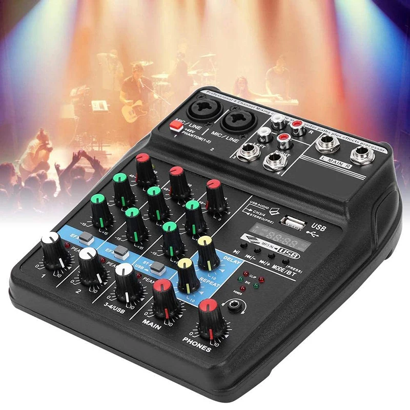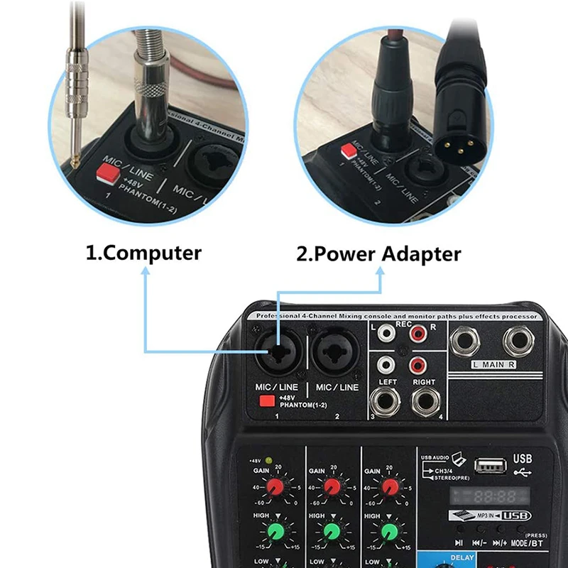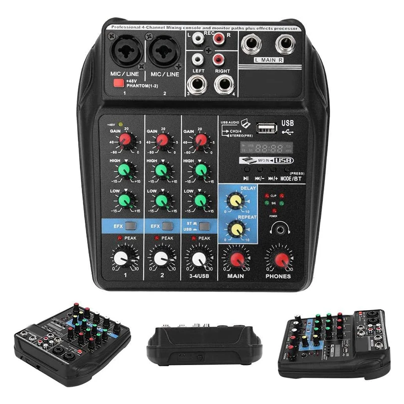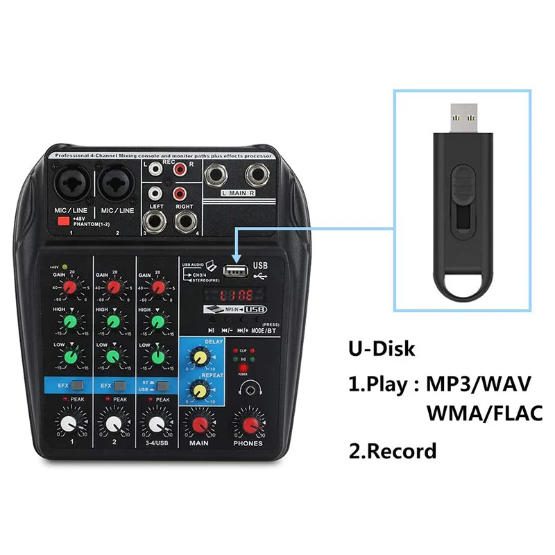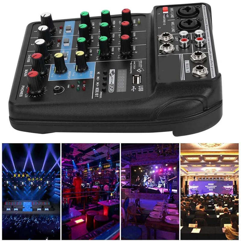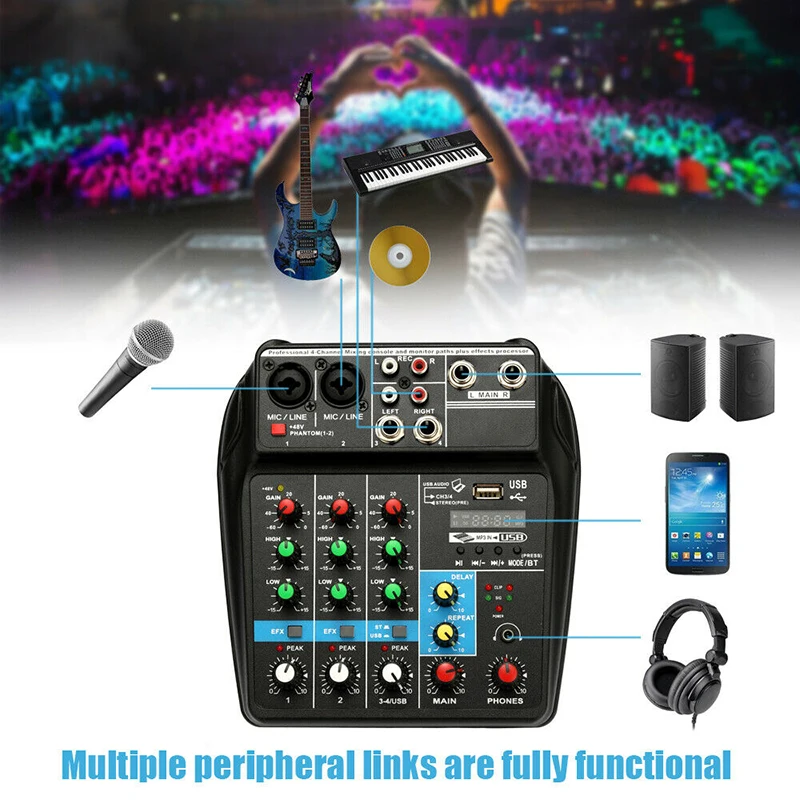 -Многофункциональный дизайн: Этот микшер представляет собой многоцелевой 4-канальный микшер со звуковой картой, который может удовлетворить потребности домашнего музыкального производства пользователей, веб-трансляции, обложки песен и т. д.