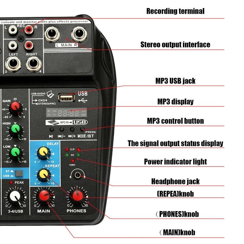 -Удобный дизайн: 2-канальный вход сигнала и 1 вход стереосигнала. 1 комплект выхода основного канала, 1 комплект выхода вспомогательного канала и обратного интерфейса. 1 Независимый выходной порт для записи. Интерфейс наушников. Модуль MP3-плеера (интерфейс USB, с функцией отображения)