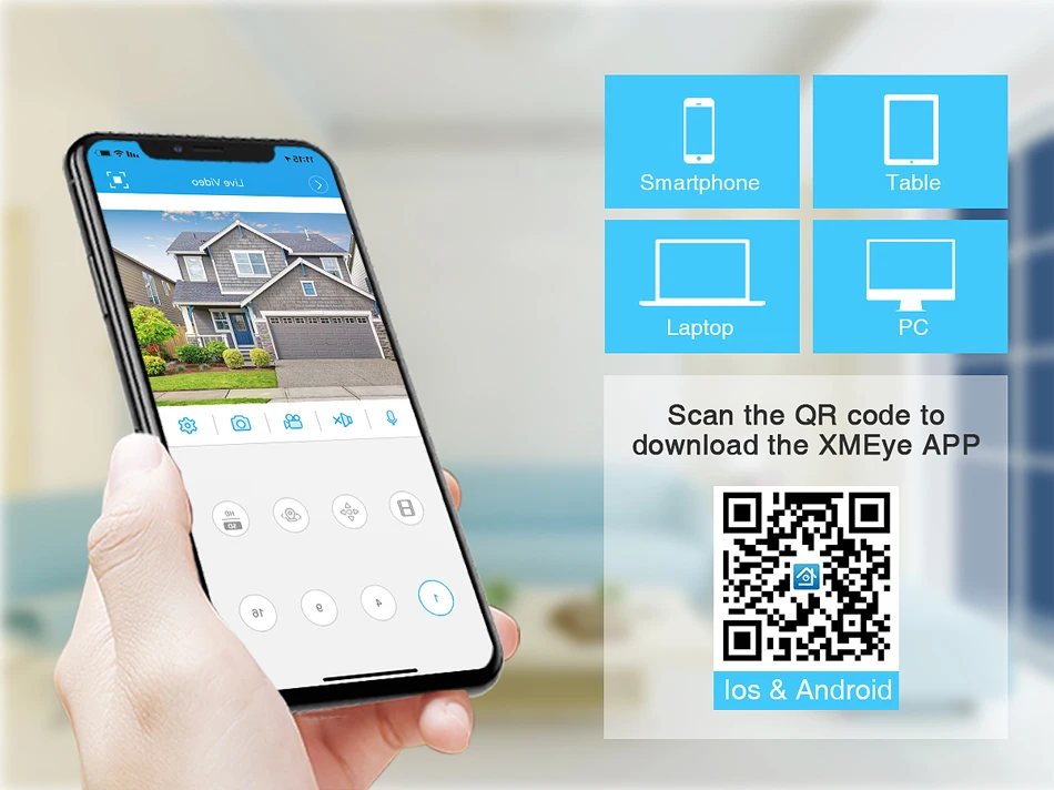 На основе технологии P2P (peer to peer), поддержка установки plug-and-play. Доступ к ip-камере через веб-интерфейс через Интернет-проводник, также поставляется с бесплатным приложением для смартфонов (Android и iPhone) для удаленного просмотра из любого места.