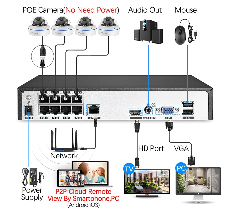 Не нужны дополнительные кабели питания или адаптеры или переключатели. Подключи и работай и простая настройка. Экономьте деньги и удобно, POE NVR = NVR + POE коммутатор.