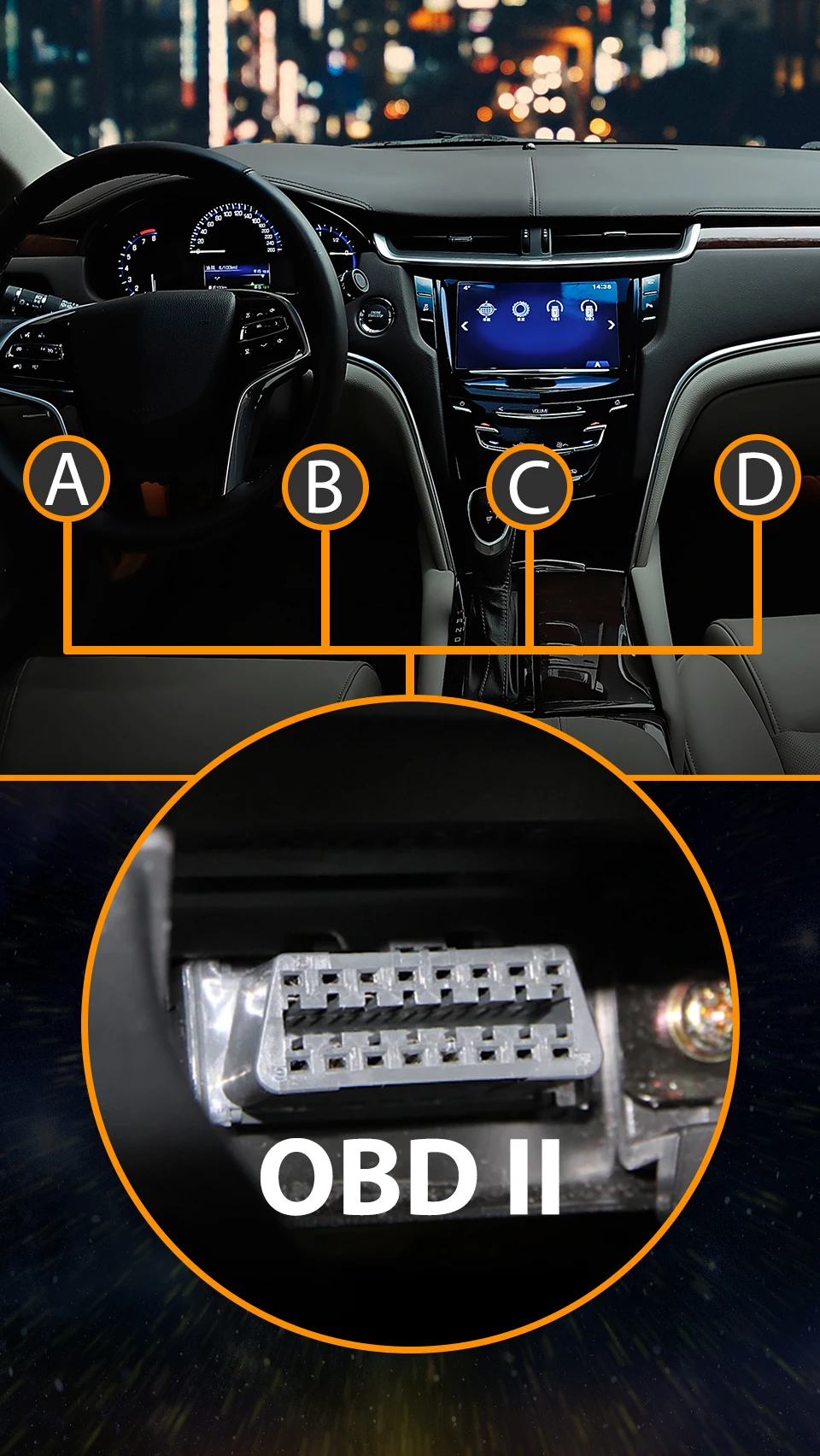 Разъем OBD2, как правило, расположен в положении «A» и «B», и для нескольких частей транспортных средств обнаружит его в положении «C» и «D»