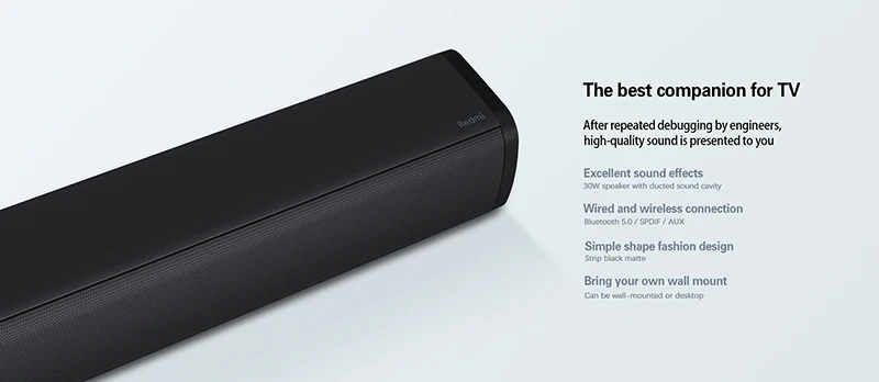 Звуковая панель Redmi TV имеет атмосферный и элегантный матовый черный, Что делает весь динамик простым и атмосферным. Простое подключение и свободное размещение Метод обеспечивает более свободный домашний просмотр. Общий развлекательный опыт телевизора был обновлен снова.