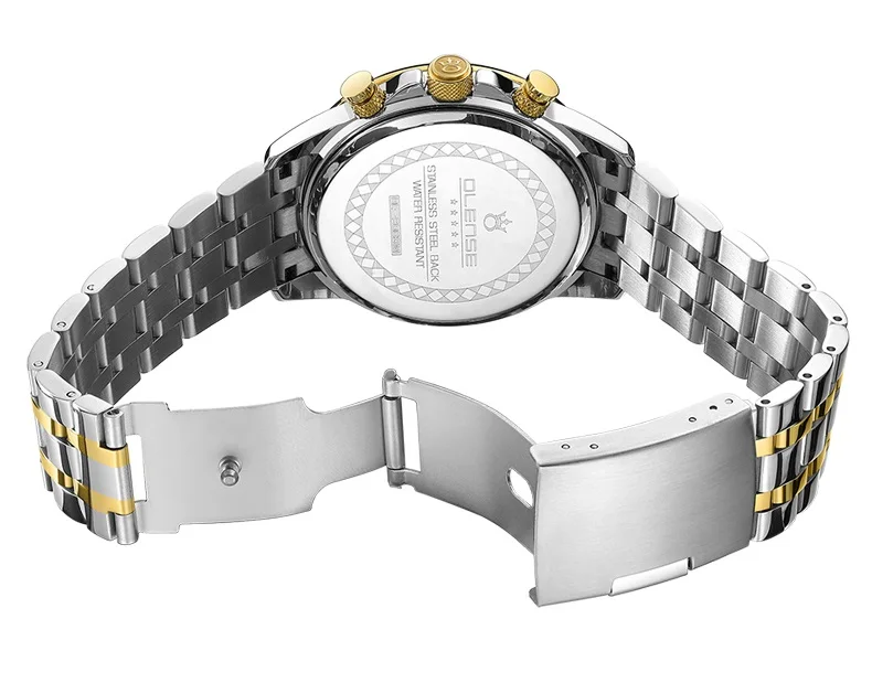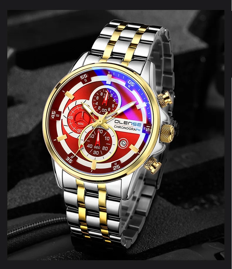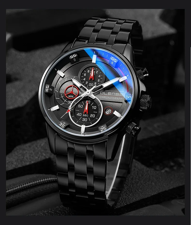 Выбор качественного процесса Стиль часов: мужские часы Чехол Материал: высококачественный сплав Материал ремешка: прочный ремешок из нержавеющей стали Чехол Ширина: 45 мм Чехол Толщина: 11,8 мм Ширина ремешка: 24 мм Длина ремешка: 230 мм Материал пряжки: Пряжка-бабочка Часовой механизм: многофункциональное движение Материал стекла: закалённое стекло с покрытием Гальванический процесс: вакуумное покрытие Вес часов: 130 г Водонепроницаемость: 3 АТМ