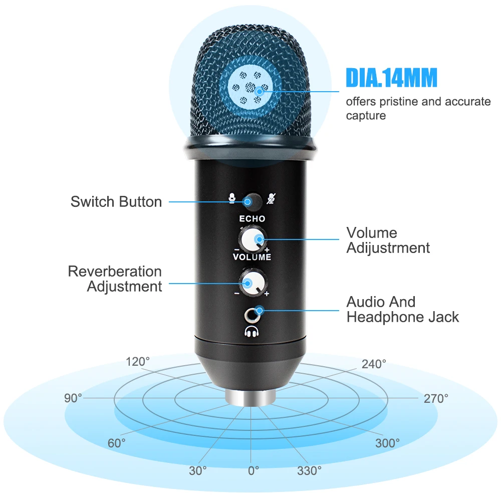 Подключи и работай: С usb-кабелем A-B микрофон E21 легко подключается как к компьютеру Mac, так и к компьютеру Windows, не требуется дополнительное программное обеспечение драйвера или звуковая карта. Идеально подходит для подкастинга, записи музыки/видео, потоковой передачи в реальном времени, игр или онлайн-общения. Отличный звук верности: Оснащен 16 мм большой диафрагмой, широкий частотный диапазон (от 20 Гц до 20 кГц) и профессиональным звуковым чипсетом, микрофон E21 обеспечивает идеальное сочетание четкости, тепла, расширенный динамический диапазон и высокая способность SPL. Капсула кардиоидного конденсатора позволяет E21 запечатлеть нетронутый и точный звук и отменить шум от окружающей среды, идеально подходит для записи и общения. Удобный дизайн: С удобной ручкой громкости, микрофон для записи E21 гораздо легче использовать. В рабочем состоянии звук от E21 mic может быть услышан и отслежен в режиме реального времени. С Эхо-ручкой может быть произведено больше музыкальных стилей. Высокая пропускная способность для системы и приложения Он совместим с системой IOS и Andriod pc.Этот микрофон совместим с Windows XP/7/8/10, Mac OS и Linux OX. Стабильный настольный штатив: Микрофон E21 имеет небольшой настольный штатив. Легко начать первое видео с компьютера на столе. Полный набор микрофонов: посылка включает в себя конденсаторный микрофон, штатив, пенопластовый чехол для микрофона, usb-кабель. Все аксессуары премиум-класса находятся в одной упаковке, что делает E21 вашим самым безопасным выбором! Характеристики: Частотная характеристика: 20 Гц-20 кГц Чувствительность:-42/2dB (1,5 V, 680) Максимальный уровень звукового давления: 125 дБ (at1kHzl % T.H.H) Выходное сопротивление: 680-/65% (0 дБ = IV/Pa dl Ikhz) Эквивалентный уровень шума: 16dBA Шум сигнала: 66dBA Ток: 3 мА Размер микрофона: 18*5 см Направленность: кардиоид Посылка включает в себя: 1 х USB конденсаторный микрофон Штатив для микрофона-1 шт. 1 х USB кабель 1 х кронштейн воротник 1 x пенопластовый чехол для микрофонаПожалуйста, обратитесь к изображению.