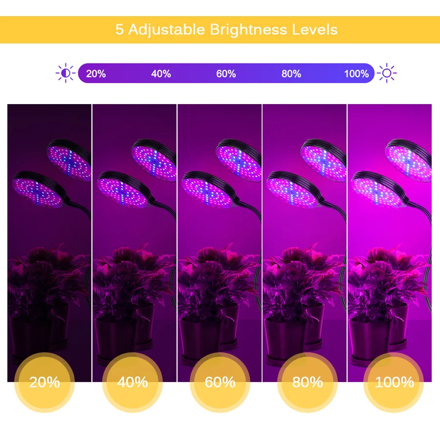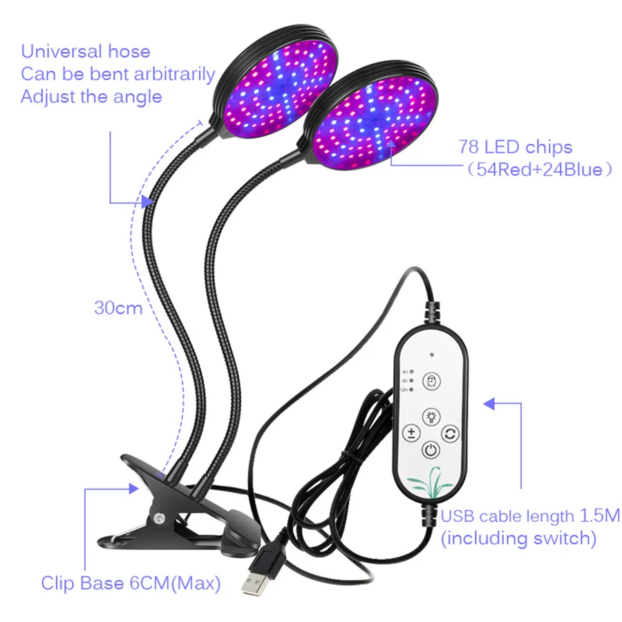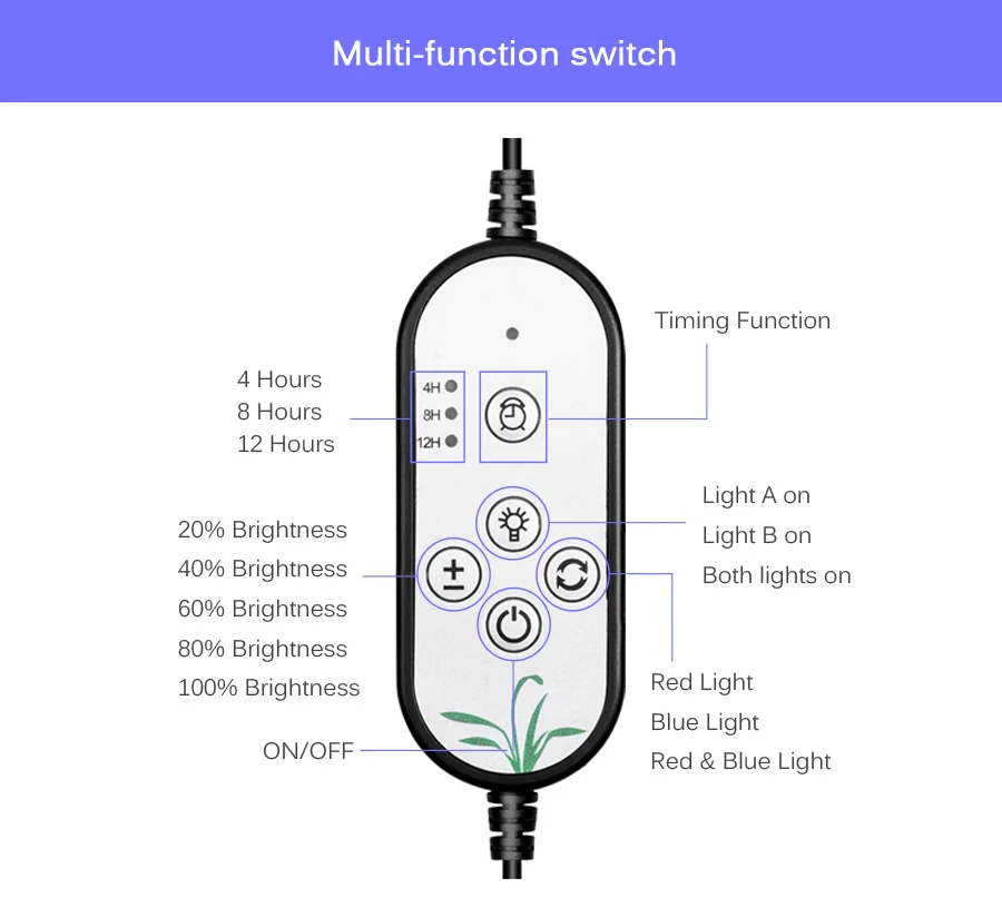 1. 3 режима таймера-4 часа, 8 часов и 12 часов; 5 режимов яркости с регулируемой яркостью; 3 варианта выбора количества освещения и переключателя Красного/синего света.
