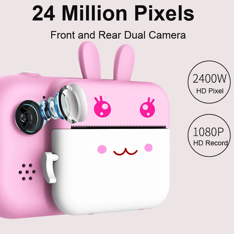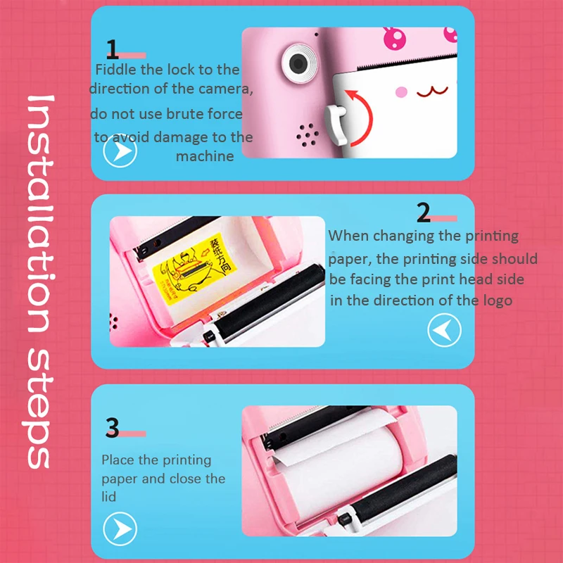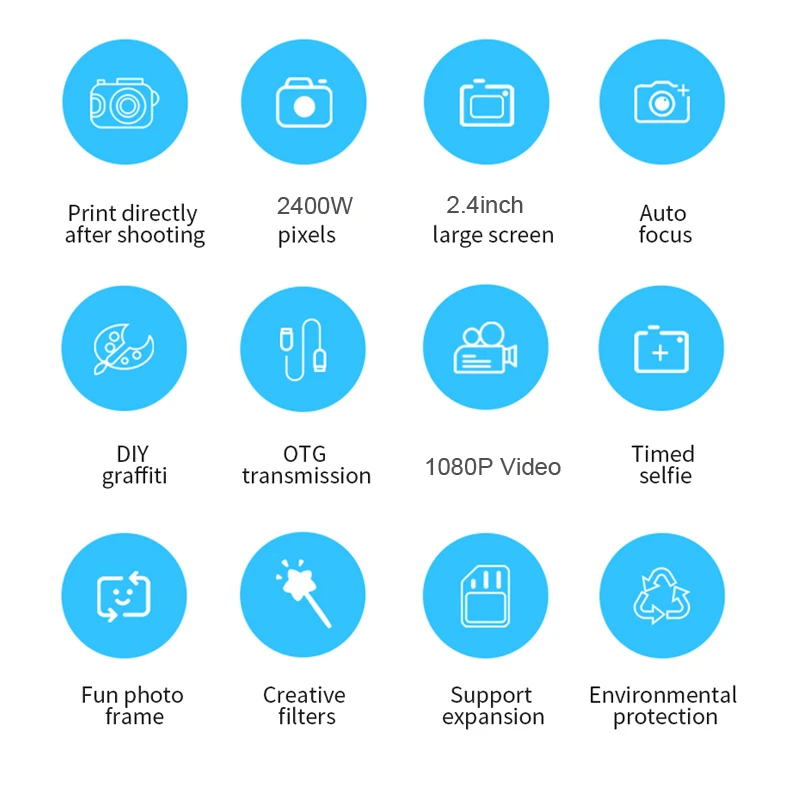 Характеристики и функции: Экран дисплея: 2,4-дюймовый IPS глаз защитная пленка Пиксель: 24 м/12 м/10 м Разрешение видео: FHD(1920*1080)/HD(1280*720) Язык: английский, русский, японский, корейский, немецкий, французский, португальский, тайский, чешский, польский, голландский, турецкий, китайский упрощенный, китайский традиционный Мощность аккумулятора: 1000 мАч Наклейки: с 9 забавными наклейками Поддержка tf-карты: до 32G Время зарядки: 3,5 часов (подходит для 2,5-3 часов) Напряжение и ток зарядки: 5 В/2 а постоянного тока Важный совет: Зарядка должна использоваться взрослыми или под наблюдением взрослых. Термальность печать Бумага Размер одного рулона: ширина 57 мм, диаметр 27 мм, длина 6 м. Толщина бумаги: 65 г. Время хранения изображений: экономьте по мере необходимости, печатные фотографии могут храниться до 10 лет. Среда хранения: Рекомендуемая температура 10 °C -30C, влажность 30% -70%, затенение, место, Избегайте тепла, вдали от земли. Продукт Содержание: 1 * Камера Мгновенной Печати 1 * Тепловая бумага (печать около 65 фотографий) 1 * USB кабель для передачи данных 1 * ремешок для фиксации на шее 1 * Руководство пользователя 1 * карта памяти (16 Гб или 32 ГБ на выбор) Советы: Из-за длительной транспортировки батарея детской камеры будет в низкой мощности, пожалуйста, зарядите перед использованием.
