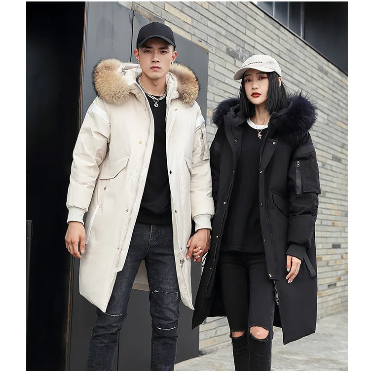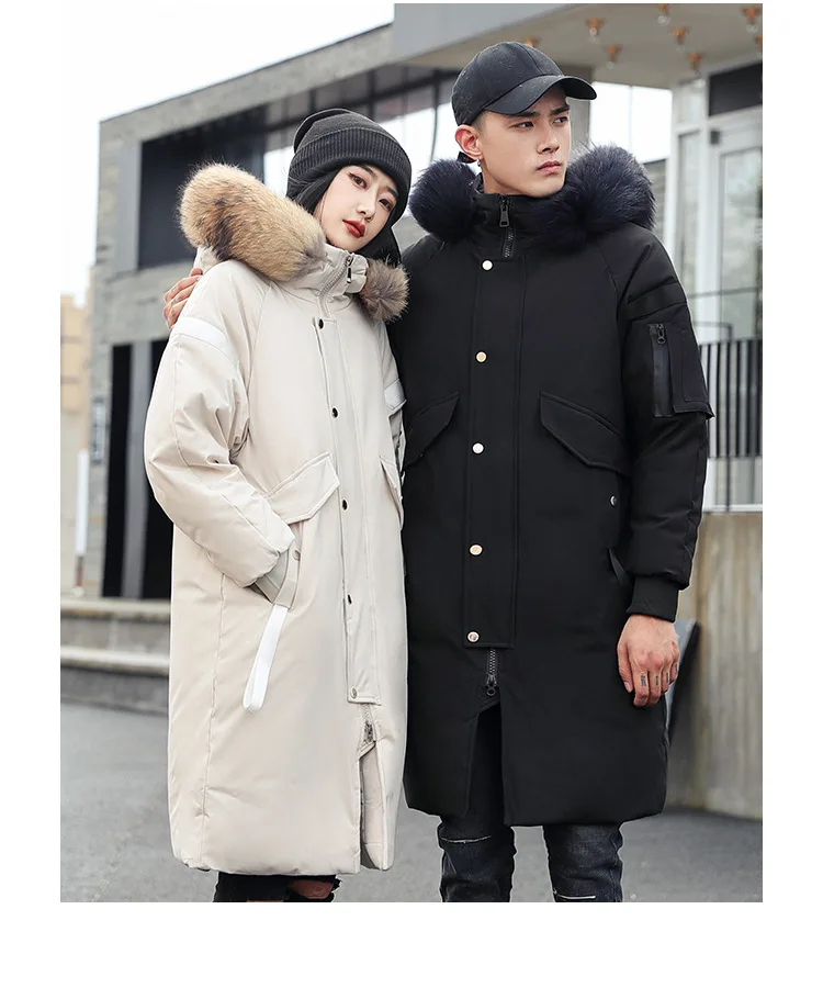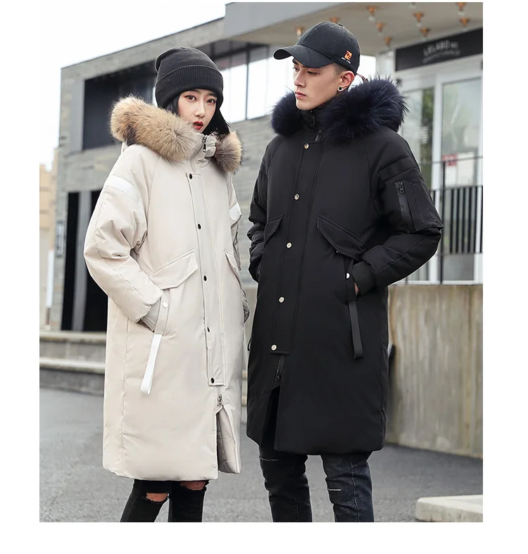 Зимняя куртка на белом утином пуху, длинная Мужская и Женская куртка-пуховик, утолщенная куртка с меховым воротником, Корейская парка с большими карманами, 2020