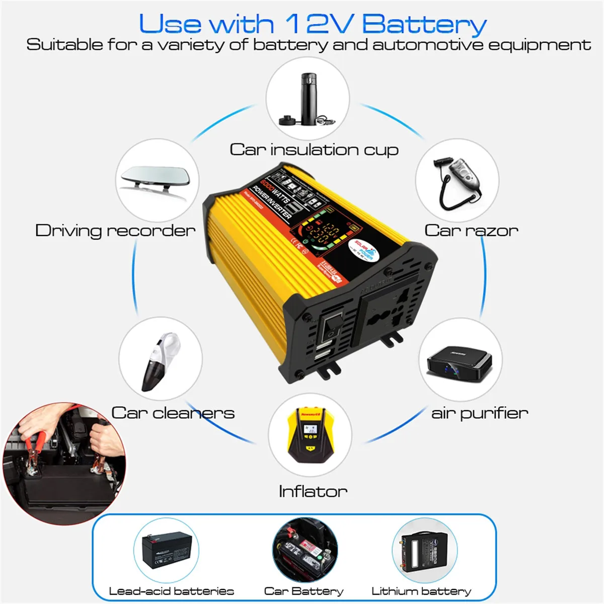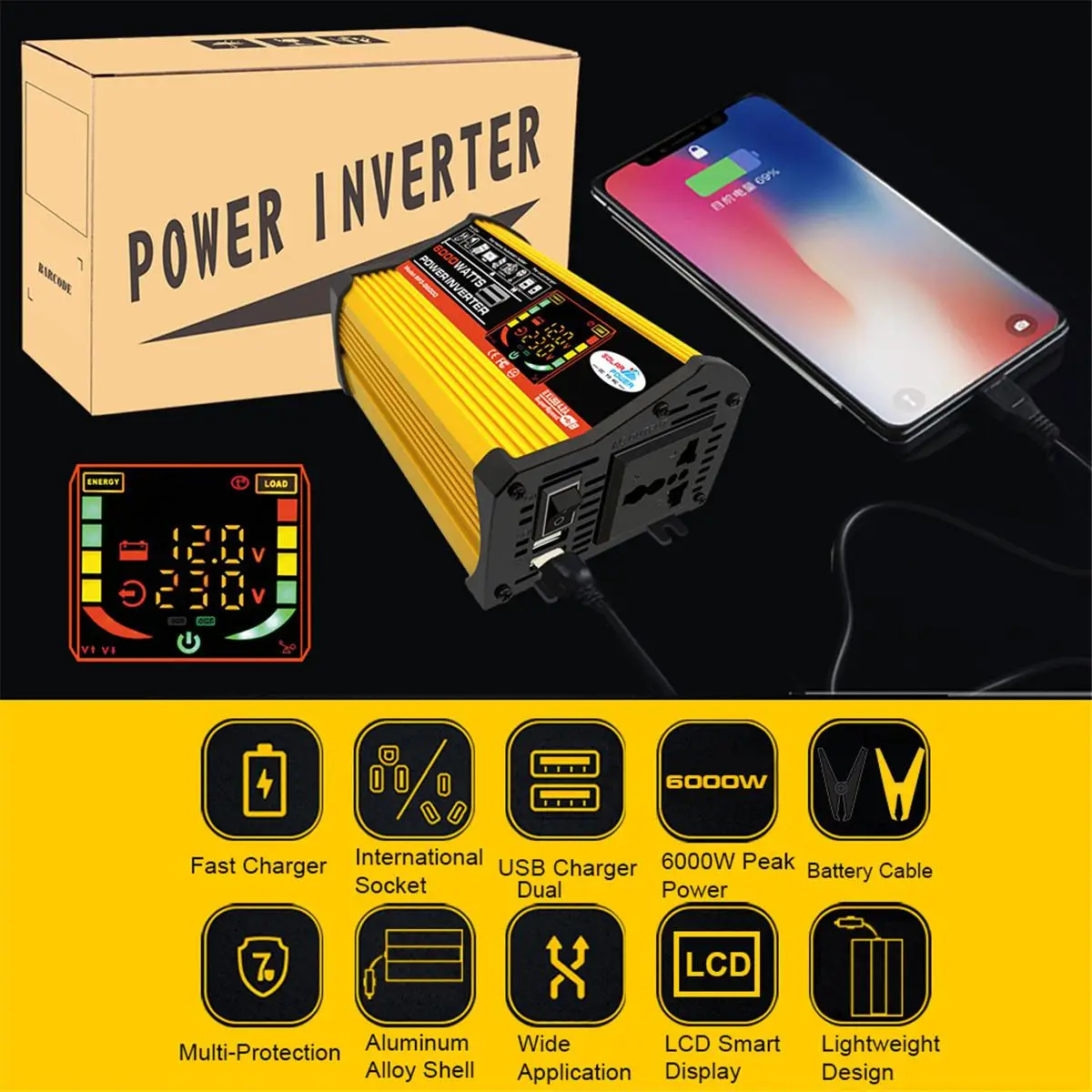 [Multi Protection] Встроенные предохранители, безопасная конструкция зарядки и охлаждающий вентилятор предотвращают перегрев автомобильного преобразователя питания, экономя мощность и энергию. Защита от перенапряжения, перегрузки, перегрузки по току, короткого замыкания, пониженного напряжения, перегрева, короткого замыкания.