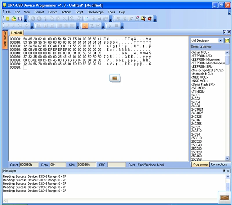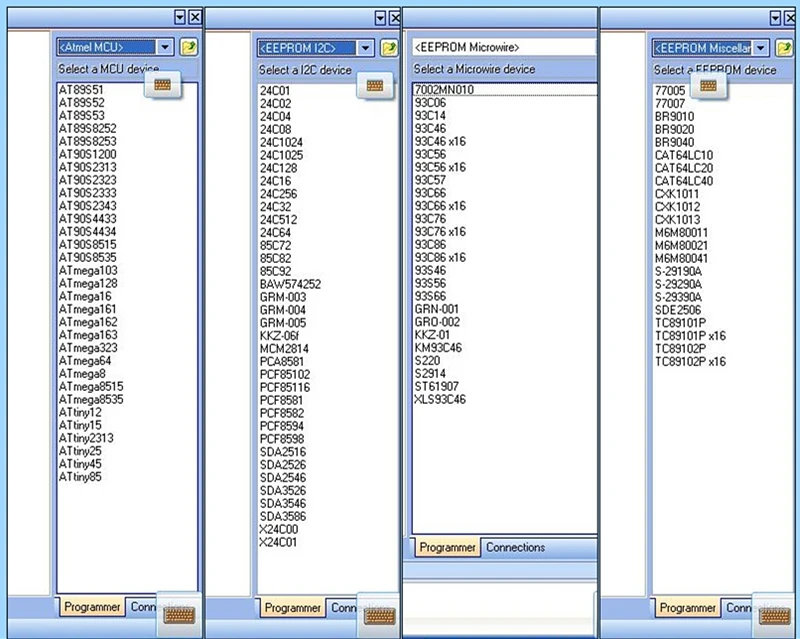 EEPROMs I2C:24C01, 24C02, 24C04, 24C08, 24C16, 24C32, 24C64, 24C65, 24C128, 24C256, 24C512, 85C72, 85C82, 85C92, BAW574252, GRM-003, GRM-004, GRM-005, KKZ-06F, MCM2814, PCA8581, PCF8581, PCF8582, PCF8594, PCF8598, PCF85102, PCF85116, SDA2516, SDA2526, SDA2546, X24C00, X24C01