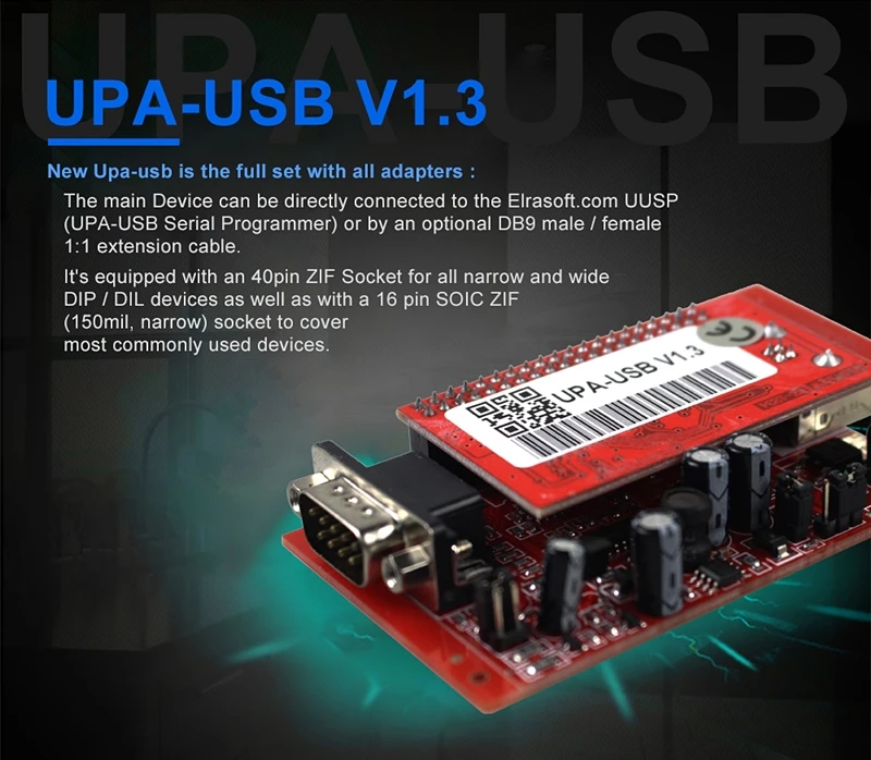 Новый Upa-usb полный комплект со всеми адаптерами, основное устройство может быть непосредственно подключено к Elrasoft.com UUSP (UPA-USB Серийный программист) или с помощью дополнительного удлинительного кабеля DB9 male / female 1:1. Он оснащен 40pin ZIF сокет для всех узких и широких DIP / DIL устройства, а также с 16 pin SOIC ZIF (150mil, узкая) розетка для покрытия наиболее часто используемых устройств.