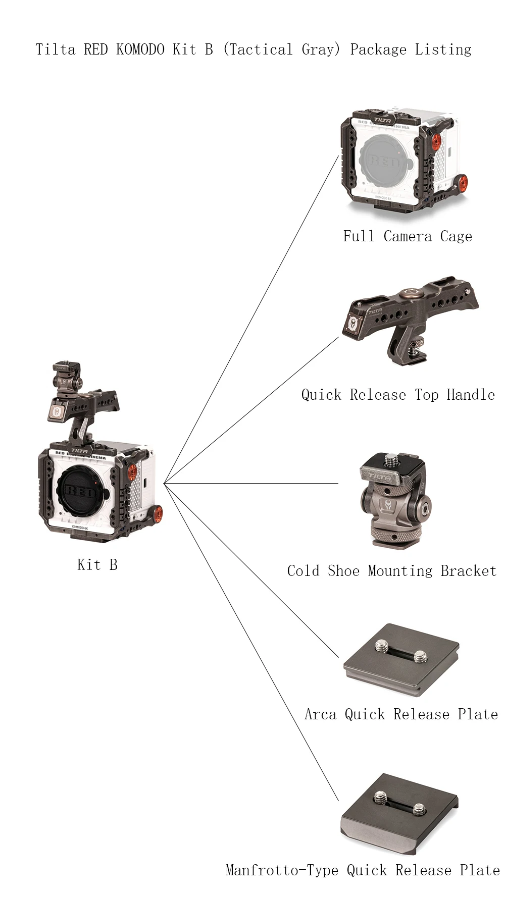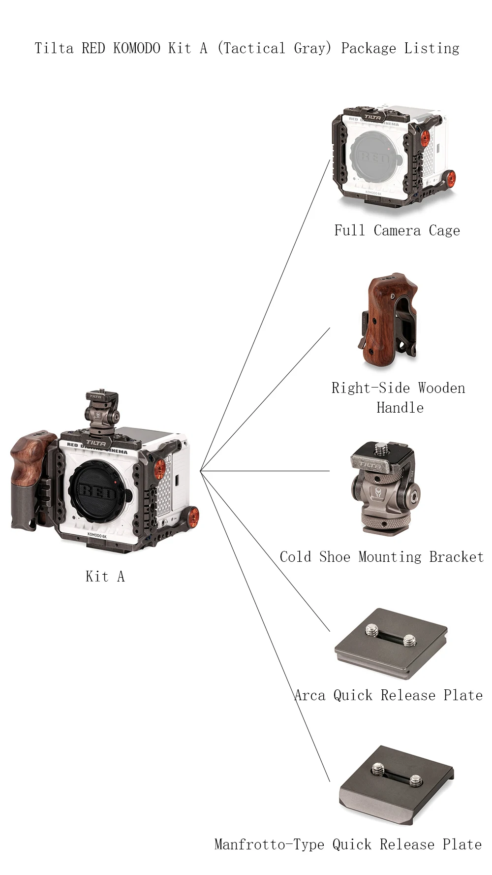 Комплект Tilta RED KOMODO E, в тактическом сером цвете, имеет полную камеру для красного KOMODO, который предлагает два адаптера розеток с каждой стороны и несколько резьбовых соединений 1/4 "-20 в нижней части для оптимальной балансировки на каркасах. В комплект также входит правая деревянная ручка с креплением NATO, вращающаяся Верхняя ручка, наклонное крепление для монитора, опорная пластина 15 мм LWS, двойной адаптер Canon BP-V-mount, И быстроразъемные пластины Arca-Swiss и Manfrotto.