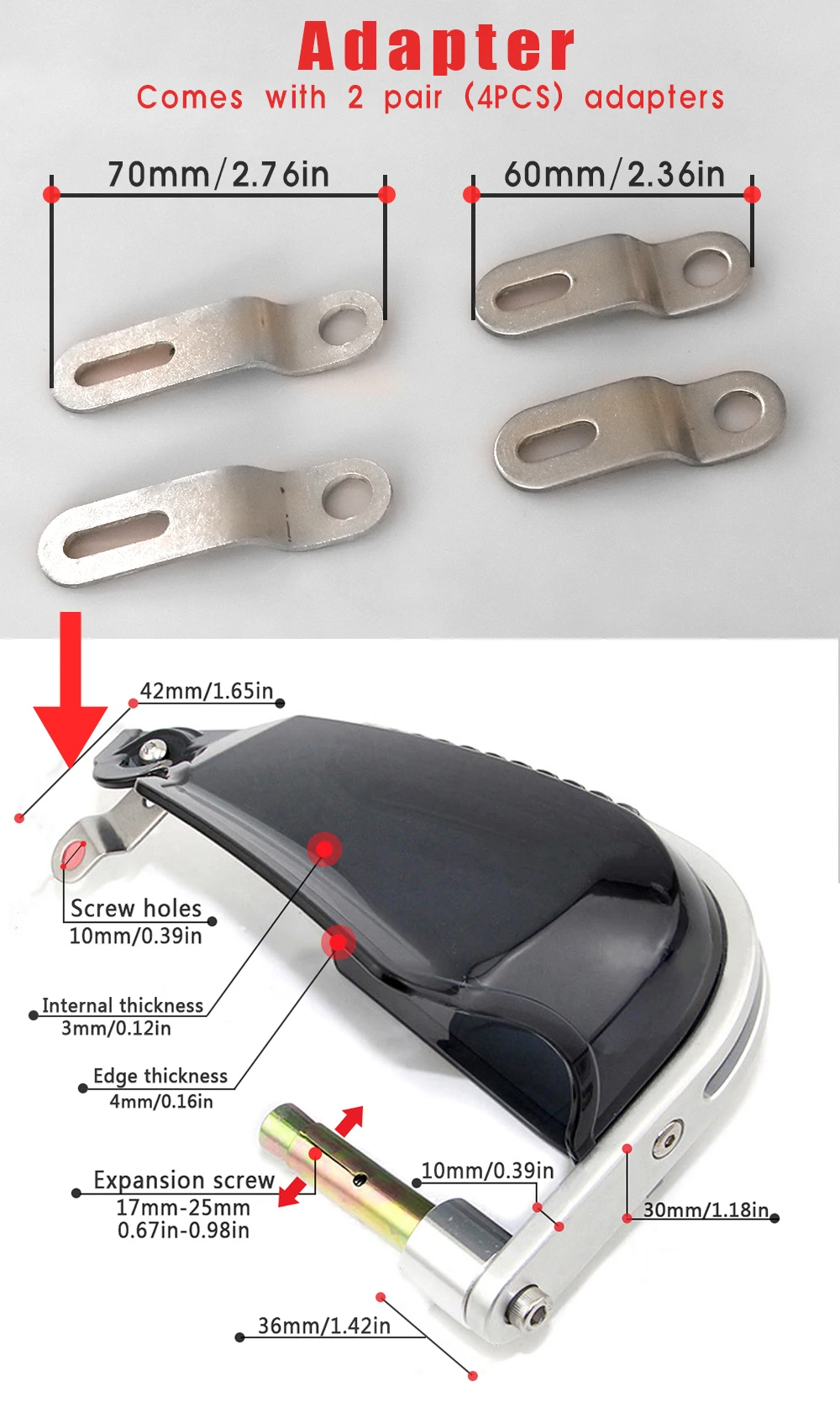 Описание продукта: 1. Все аксессуары этого продукта были тщательно протестированы. Он может эффективно защитить руль мотоцикла и ручку тормозной муфты. И обладает эффектом выпрямления и ветрозащиты. 2. Этот продукт может быть установлен на интерфейс зеркала заднего вида мотоцикла или на рычаг тормоза. 3. Данный продукт оснащен двумя видами Адаптеры расширения. Может применяться для более чем 95% моделей мотоциклов. 4. Номинальное напряжение 12 В. Синий провод подключается к отрицательному полюсу тока. Коричневый провод подключается к положительному току. Можно подключать к поворотникам, фарам, сдвоенным вспышкам и замкам зажигания. 5. Пожалуйста, свяжитесь с нами, если у вас возникли какие-либо проблемы после покупки. Мы решим проблему как можно скорее.