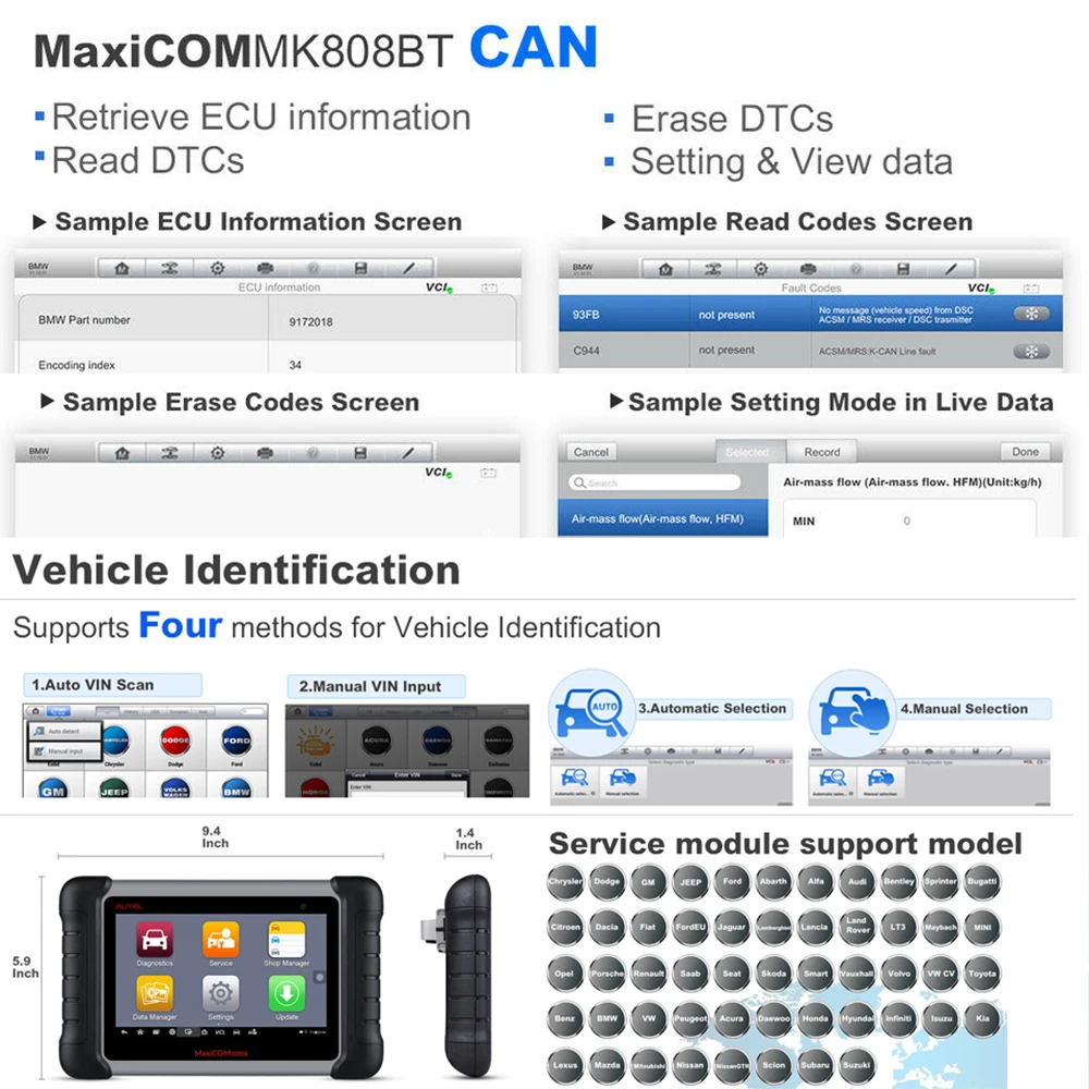 Благодаря мощной Cortex-A9 процессор, а также 7,0 дюймов ЖК-дисплей емкостный сенсорный экран, на базе Android многозадачность операционная система, И в сочетании с возможностью быстрого чтения и очистки DTCs для всех доступных модулей большинства марок и моделей на рынке, MaxiCOM MK808BT-это ваш идеальный инструмент для автоматической диагностики и обслуживания. MK808BT предоставляет вам превосходные специальные функции, включая сброс масла, EPB (электронный стояночный тормоз), SAS (датчик угла поворота руля), BMS (система управления батареей), И DPF (Дизельный сажевый фильтр).