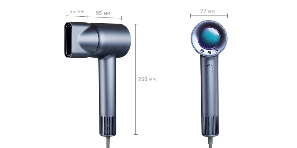 The body of the hair dryer Zhibai is made in a refined gray color, and its front part is covered with a special varnish-Chameleon, iridescent with many shades of of. A special UV-varnish on the surface is pleasant to the touch, while it is not afraid of scratches or dirt.