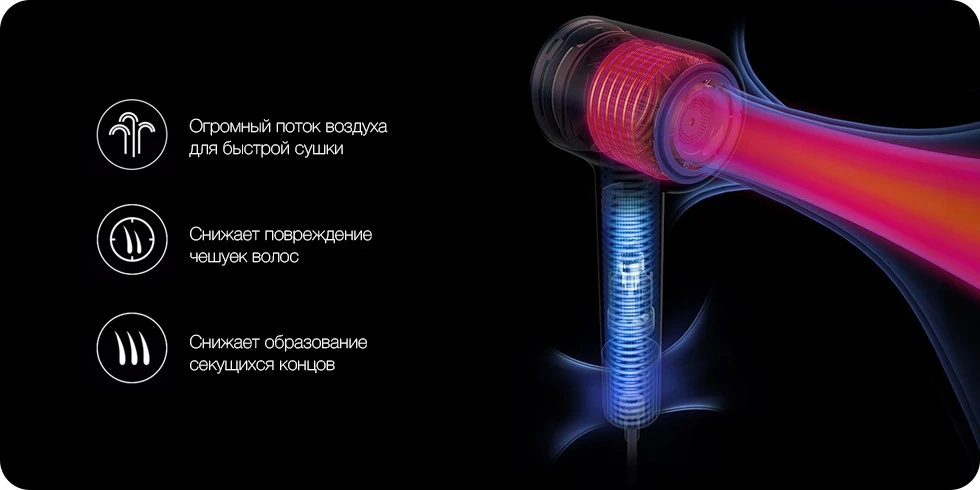 Smart temperature control is carried out with special sphere sensors, which 50 times per second measure the temperature of the released air and transmits the data into a dual-core processor that controls the heater the heating so that it does not heat above a safe mark for hair.