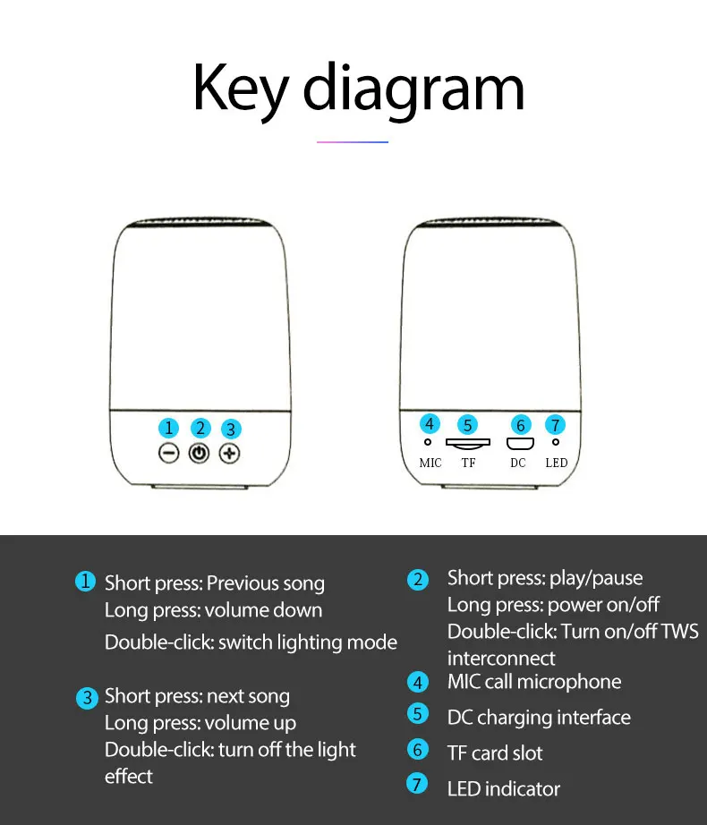1. Когда динамик работает, его можно настроить, чтобы излучать Яркие мигающие огни, и с музыкой, вы можете полностью расслабиться и наслаждаться жизнью