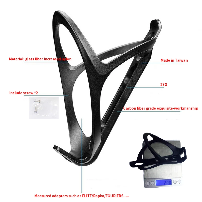 Особенности: Поможет вам поместить бутылку воды в велосипед. Изготовлен из нейлона из стекловолокна, вес супер-светильник. Прочная конструкция, предотвращает деформацию и повреждение. Подходит для различных типов велосипедов, включая горный велосипед и складной велосипед. Описание: Материал: нейлон из стекловолокна 100% новый товар высокого качества. Простая установка на комплект и подходит для большинства бутылок. Цвет: матовый черный Вес: 27 г