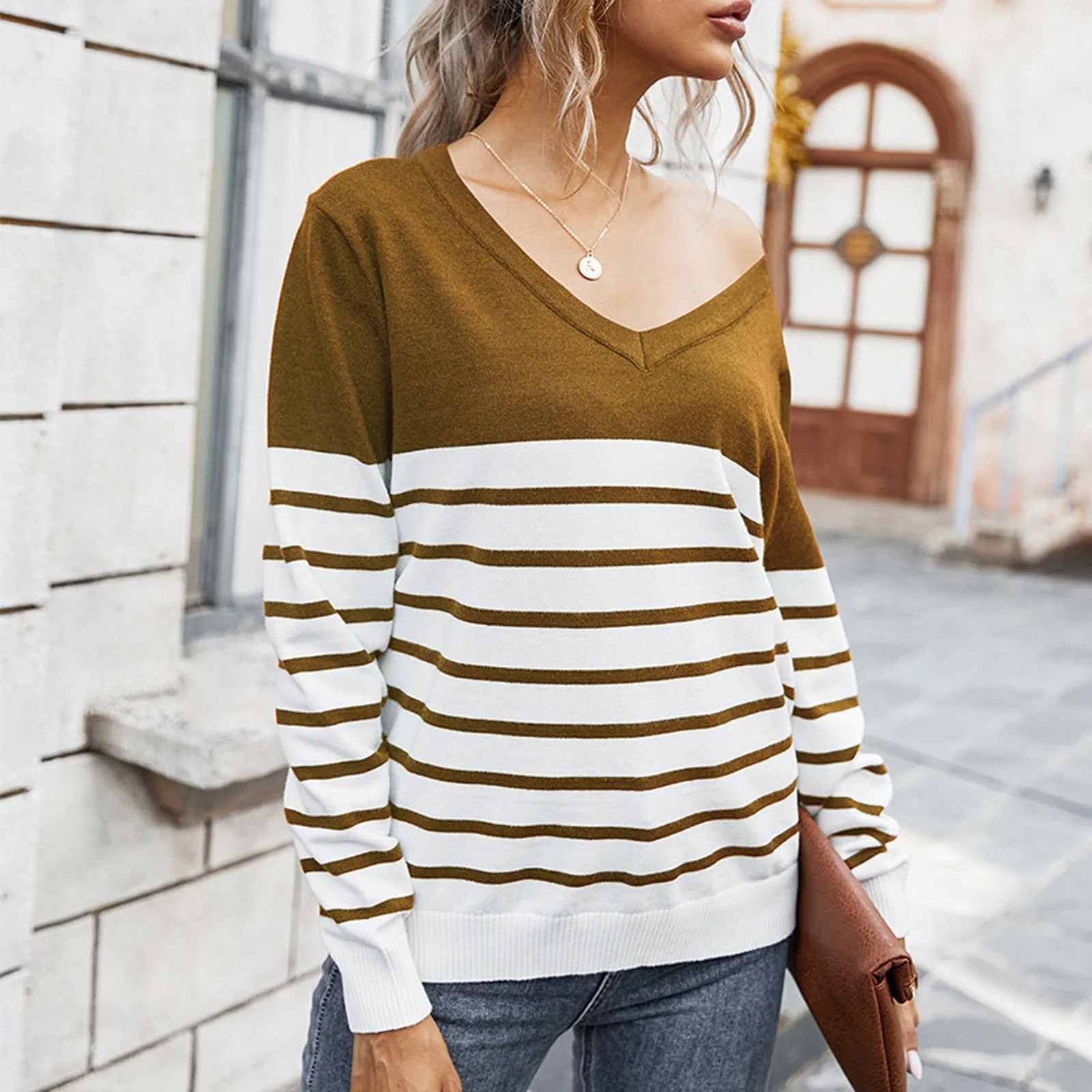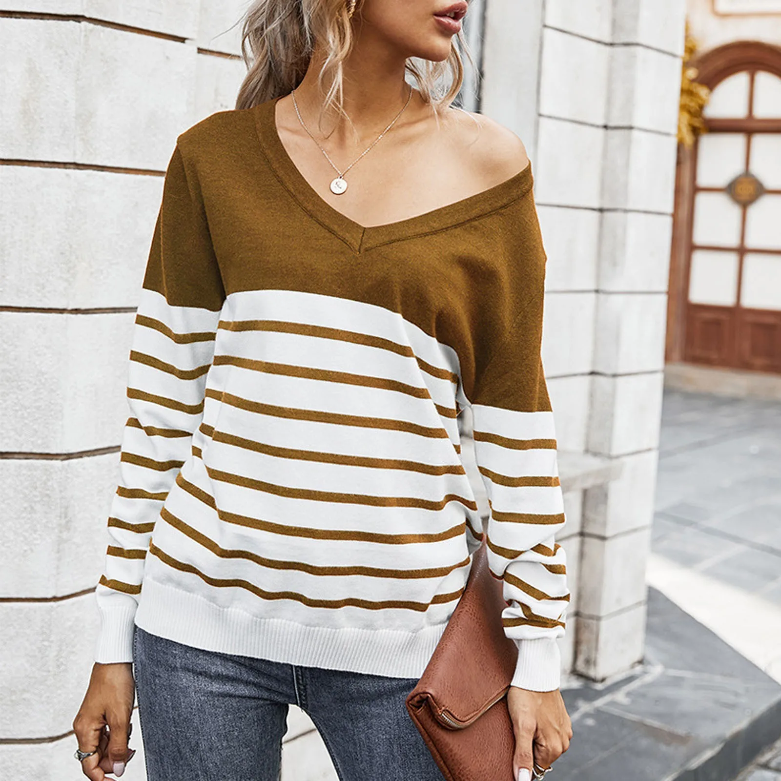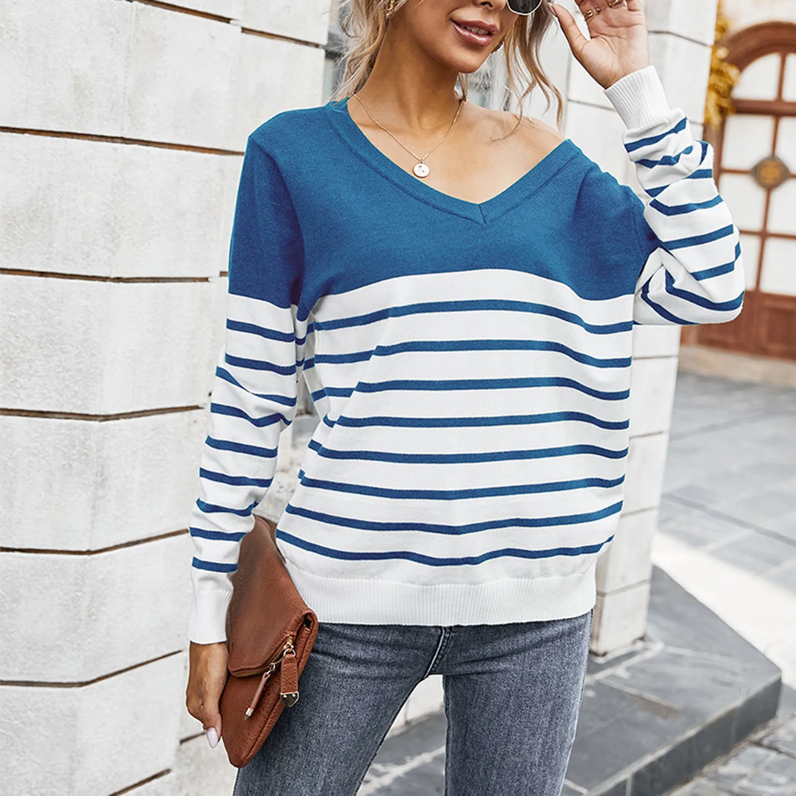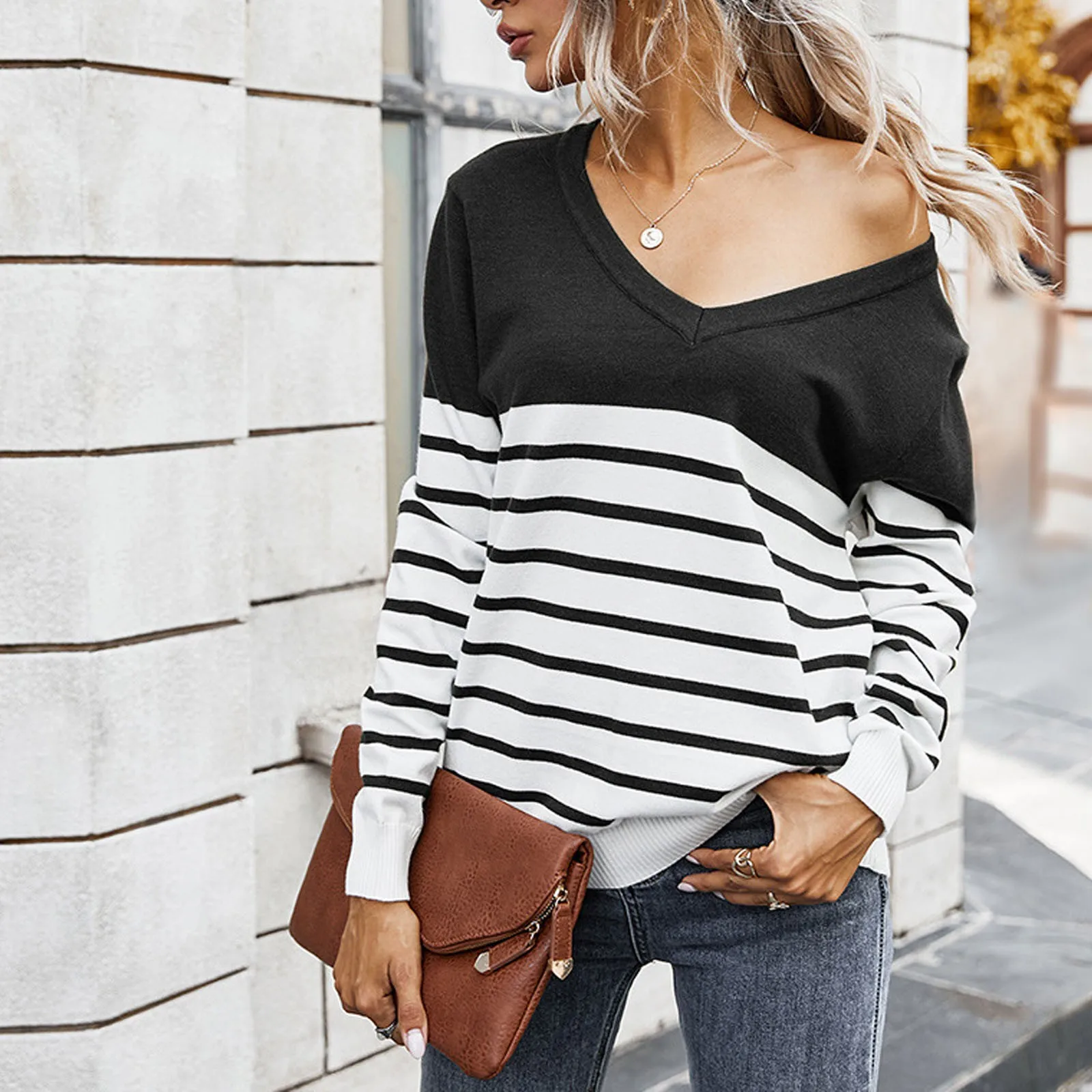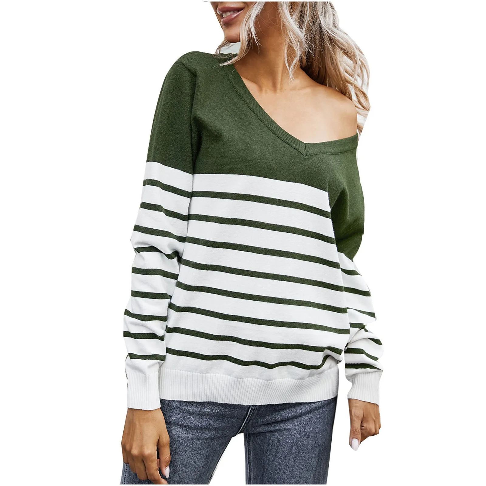 Women’s Casual Long Sleeve Sweater Stripe Print Color Block Loose Pullover Tops