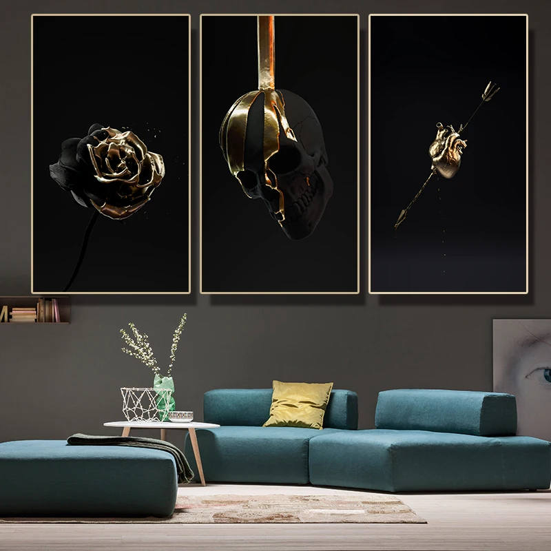 Холст печать плакаты черный и золотой розовый череп, сердце современное искусство живопись Гостиная Hoom Декор HD Европа абстрактная Настенная картина на заказ Классический светильник Роскошная прикроватная картина