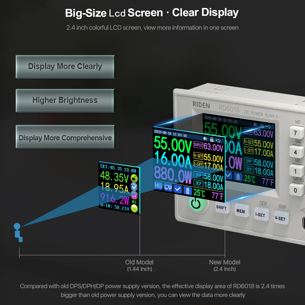 Это своего рода качественный источник питания постоянного напряжения постоянного тока с постоянным током, выходное напряжение 60 в, выходной ток 18 А, выходная мощность 1080 Вт, сильный и мощный. Большой размер 2,4 дюймовый цветной ЖК-дисплей экран, высокая яркость, информация будет отображаться на одном экране. Клавиатура + кодировщик регулировки комбинации потенциометра, мгновенное Хранение/вызов настройки параметров.