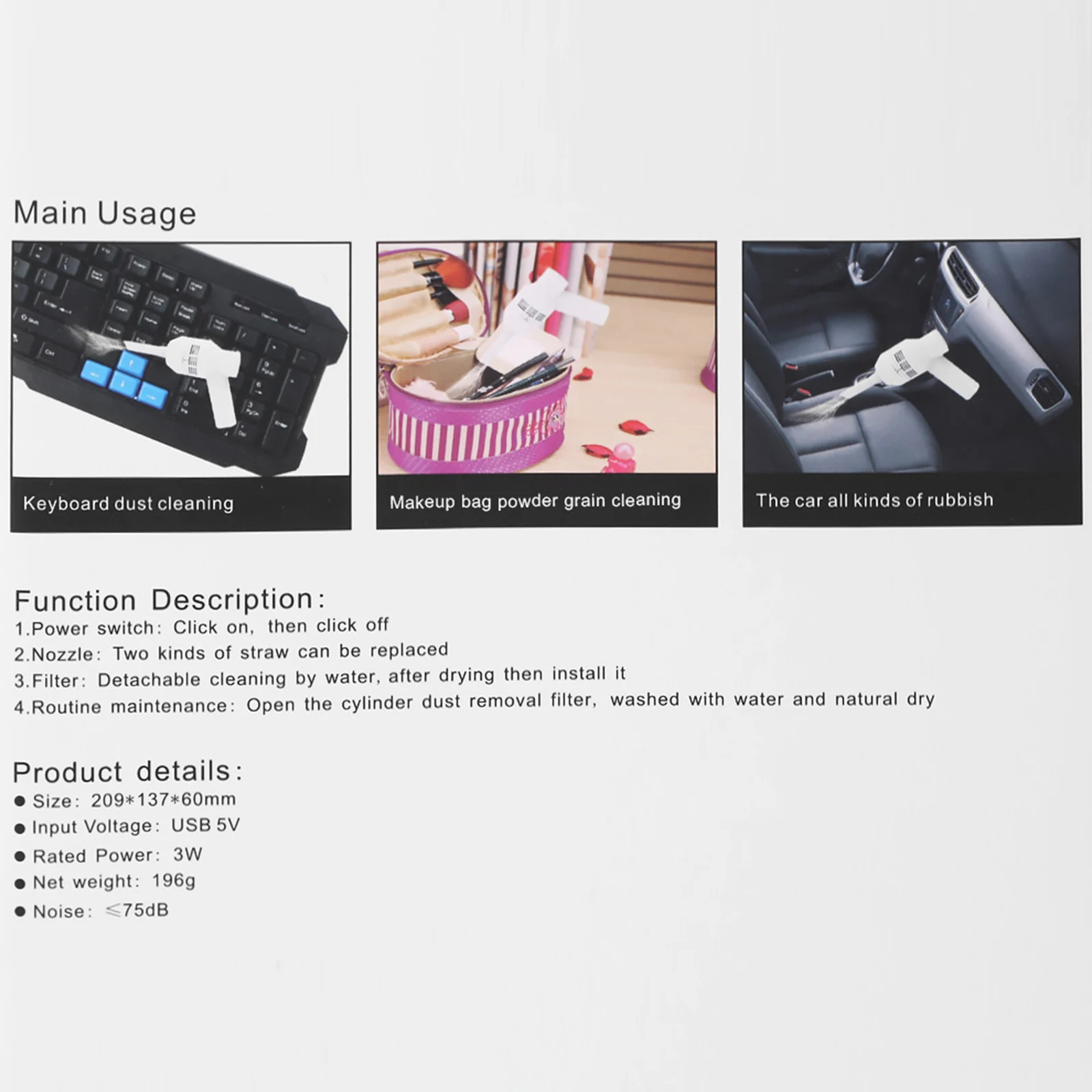 Этот пылесборник идеально подходит для очистки канавок, зазоров и других сложных поверхностей автомобиля, компьютерной клавиатуры, косметички, цифровой камеры, набора телефонов, электронного оборудования и многого другого. Вы можете позаботиться о вашем компьютере или камере с помощью нашего всасывающего пылесоса.