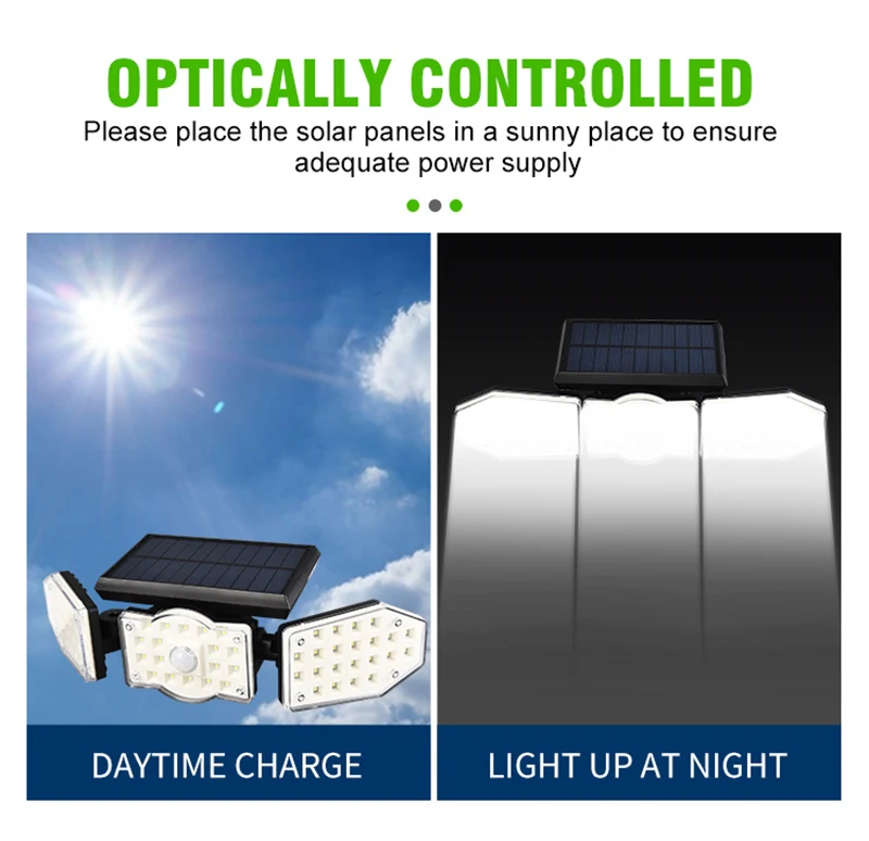 Solar Motion Sensor Light Outdoor is equipped with 120 degree angle and sensitive motion sensor, which can provide illumination widely and without delay. Once the sensor of Solar Spotlights Outdoor detect the motion, there will be 30s illumination and without motion detected for long time the lights will auto turn off.
