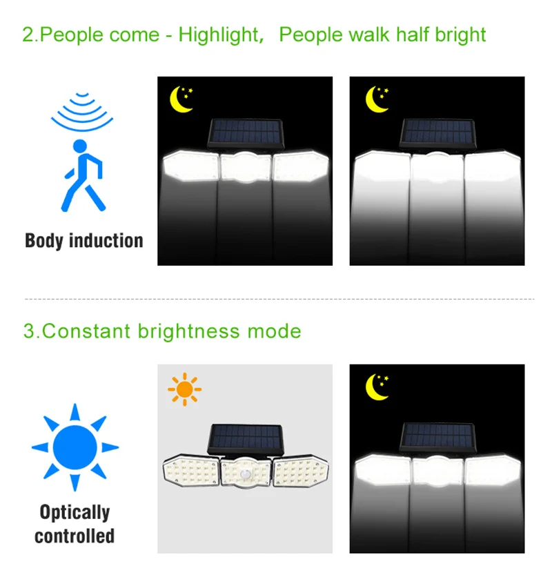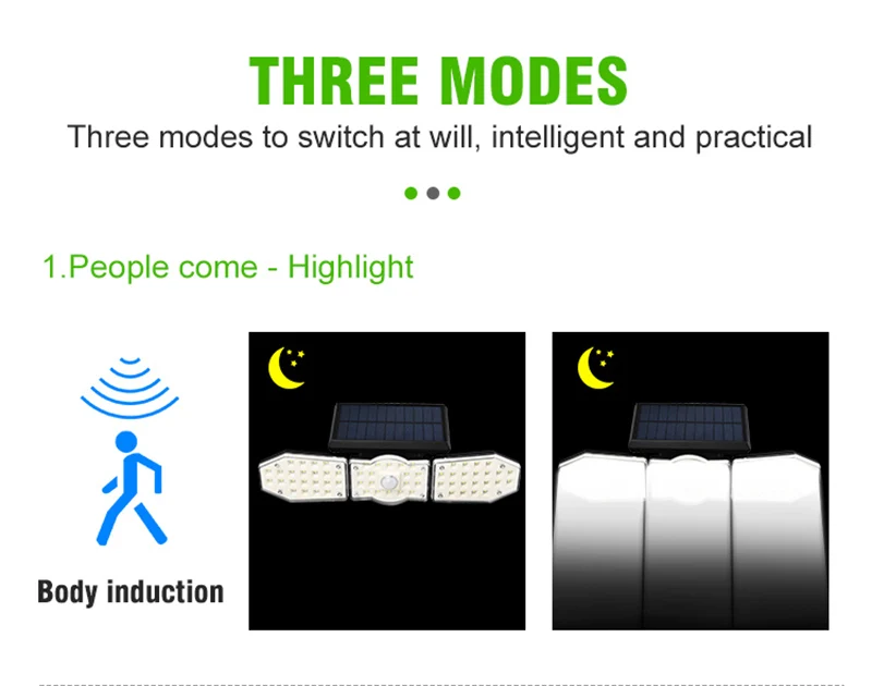 Mode 2: Human body induction + low light mode (light on when people pass by, low light 20-30 seconds after people leave, and light up again when someone passes by)