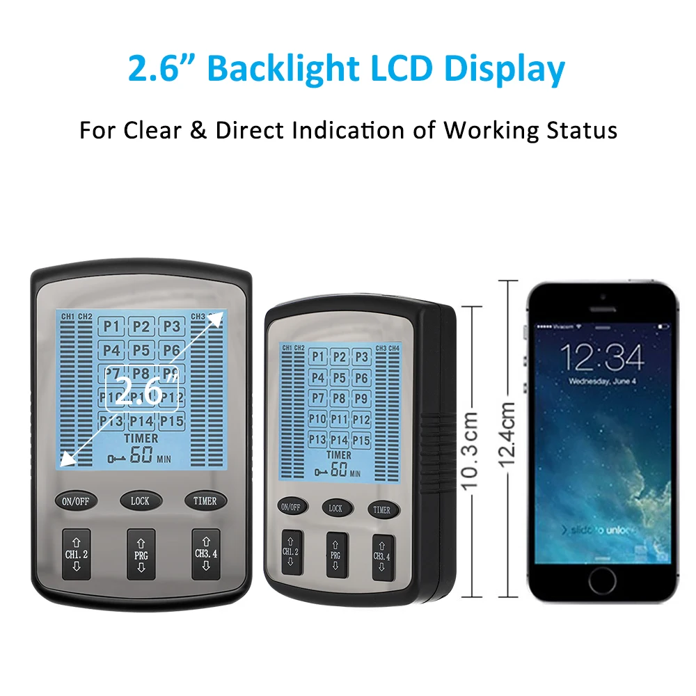 4. Поддержка 4 независимых выхода (CH1, CH2, CH3, CH4 каналы), чтобы разрешить индивидуальные приложения на различных областях тела с различной интенсивностью массажа одновременно, практично делиться с друзьями или семьей вместе.