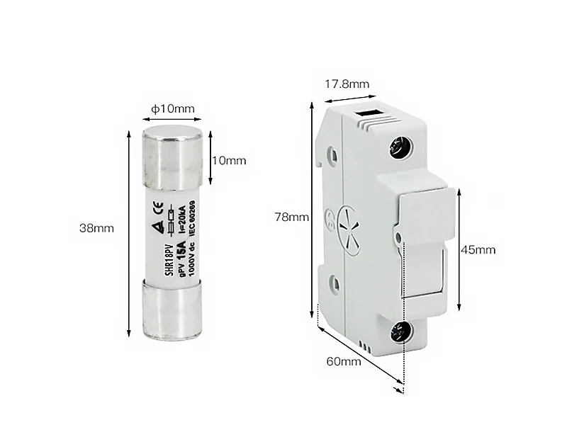 This holder is suitable for PV fuses rated 1A,3A,5A,10A, 15A, 20A, 25A and 30A. The maximum voltage is 1000V. The fuse holder can be combined with the following PV String Fuses which is essential protection for solar panels. - 1000V DC-20B - Modular 45mm cut out - 1 module (17,5mm) X pole - Mounting 35mm DIN rail - High temperature resistant plastics - Elevated insulation characteristics