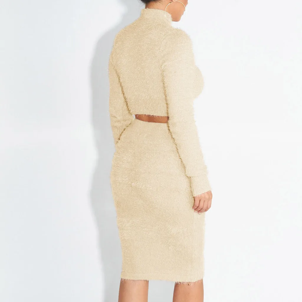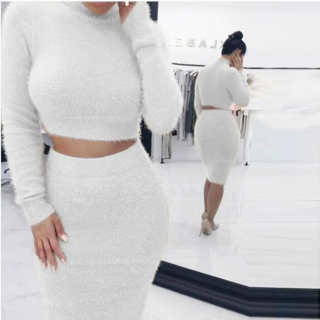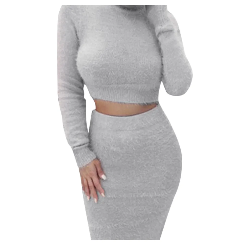 Женский комплект юбки и свитера, зимний укороченный Топ с длинным рукавом + юбка-карандаш, вязаный костюм