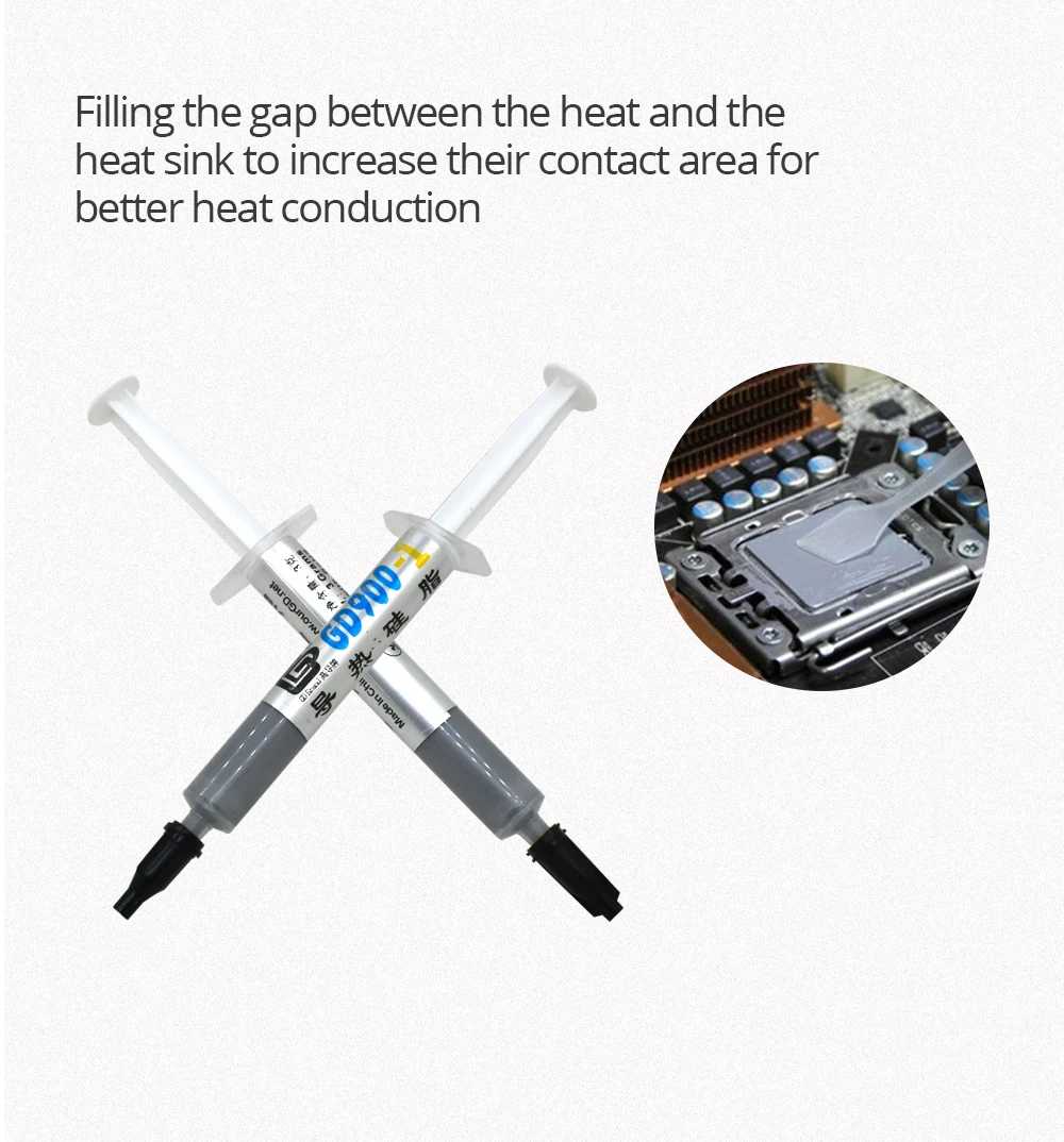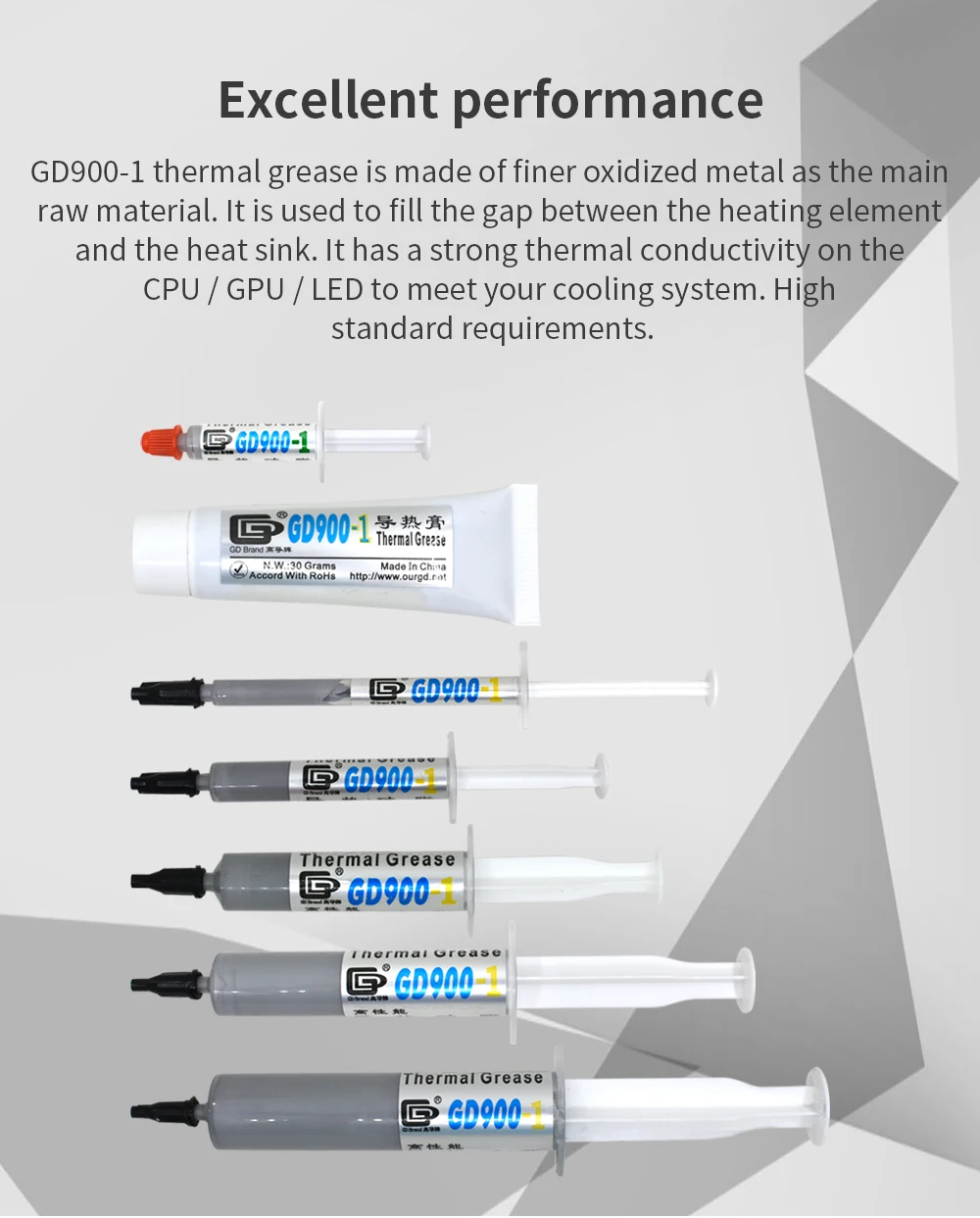 GD900-1 термопаста: Цвет: серый Удельный вес: 2,5 г/см3 Теплопроводность: 6,0 Вт/м-K Рабочая температура: -58 ~ 248 градусов по Фаренгейту GD900-1 Более вязкая термопаста, но ее легко размазывать. Пожалуйста, размажьте его равномерно, как толщина бумаги формата А4. Лучше выделить Сверхбыстрый охлаждающий эффект.