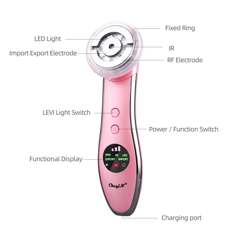 1. ИК (инфракрасный): длина волны составляет от 940нм до 1 мм и обладает определенным тепловым эффектом. Повышает температуру кожи и подкожной клетчатки, способствует циркуляции крови, метаболизму и регенерации клеток. 2. Экспорт (ионное удаление): эффективно удаляет грязь для кожи лица. 3. Импорт (ионтофорез): улучшает поглощение продуктов по уходу за кожей. 4. Красочный светильник: укрепляет ремонт кожи, ускоряет синтез белка и стимулирует регенерацию коллагена; Ускоряет метаболизм фибробластов и способствует регенерации клеток; Повышает клеточную иммунную функцию и устраняет воспаление. [Красный светильник] длина волны 620нм, повышает эластичность кожи, уменьшает поры, удаляет морщины и омолаживает кожу. [ЗЕЛЕНЫЙ светильник] длина волны 520нм, удаление акне, угрей и акне. [Синий светильник] длина волны 46 нм, стерилизация, уменьшение секреции масла [Оранжевый светильник] длина волны 610нм, задержка старения кожи, удаление морщин и омоложение кожи. [Фиолетовый светильник] длина волны 430нм, усиливает проникновение эссенции и позволяет ей быть естественным и глубоко поглощенным. 5. EMS (микроток): производит высокоэнергетическую Акупунктура пульса, мгновенно повышает проницаемость кожи, улучшает поглощение кожи продуктами по уходу за кожей, делает кожу более упругой и эффективно тонкой. 6. RF (радиочастота): проводимость через наконечник электрода нагревает подкожные мышцы, стимулирует коллаген, способствует циркуляции крови и значительно улучшает функцию поглощения продуктов по уходу за кожей.