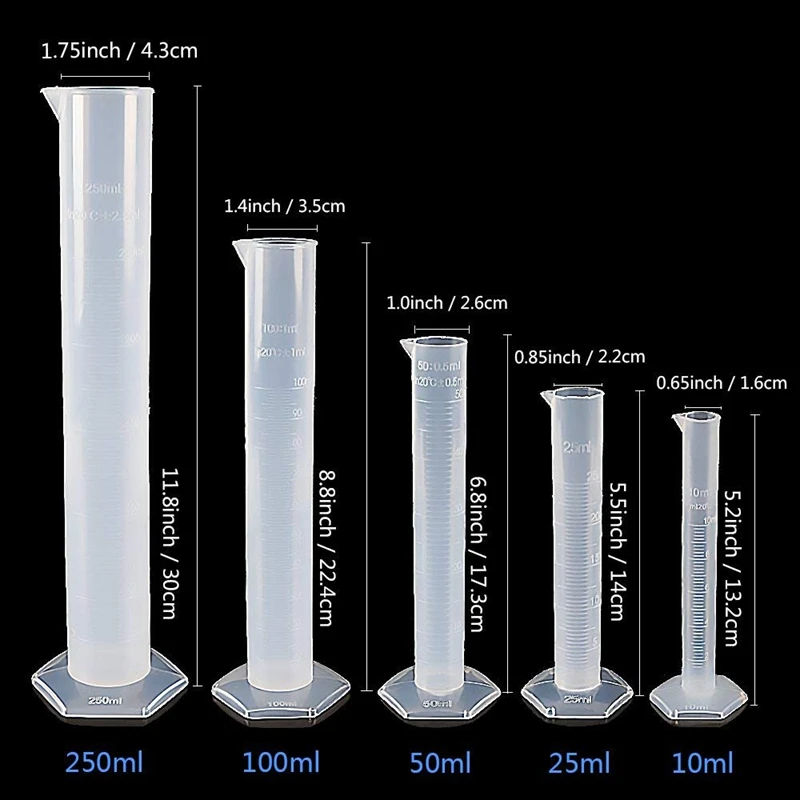 Емкость цилиндров: 10 мл, 25 мл, 50 мл, 100 мл, 250 мл. Легко чистить, можно использовать снова и снова пластиковый градуированный цилиндр для лабораторных испытаний.