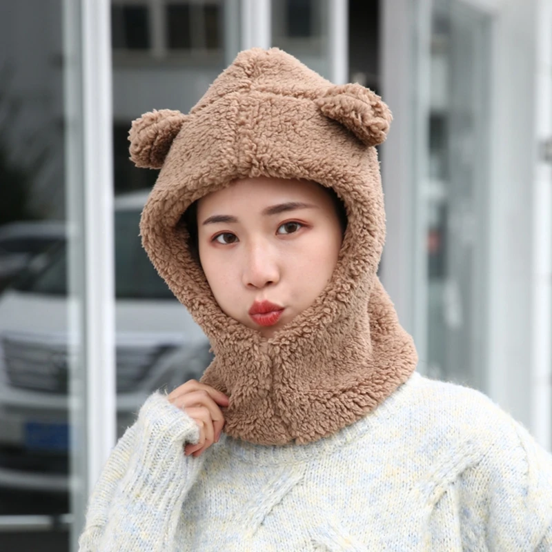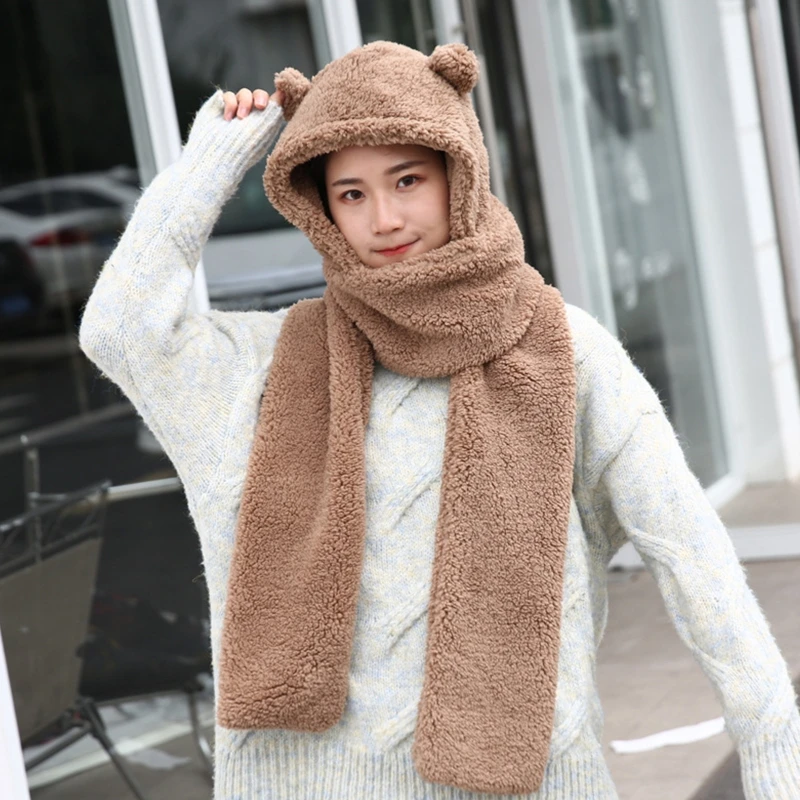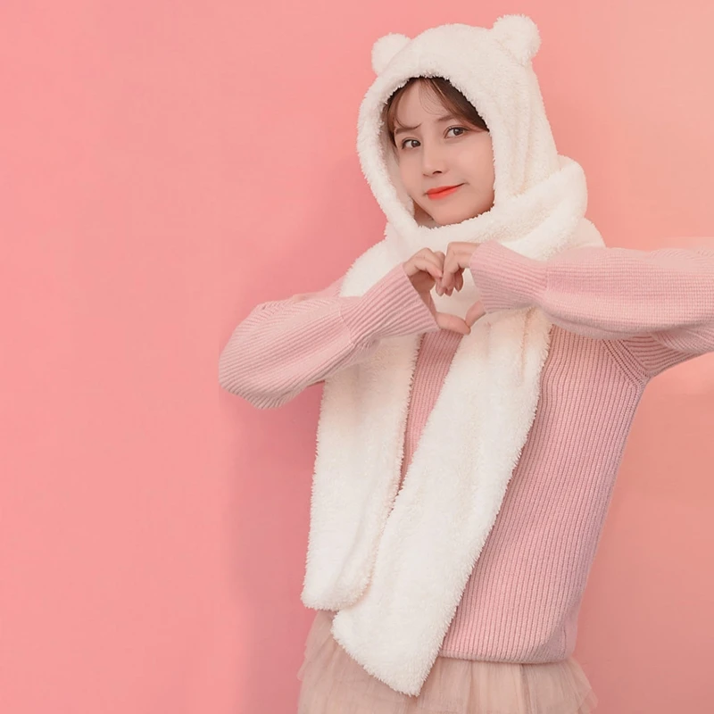 Женский зимний цельный шарф-шапка с милыми медвежьими ушками, шапка-ушанка с капюшоном, плотный плюшевый теплый однотонный шарф, подарок реквизит для фото вечеринок