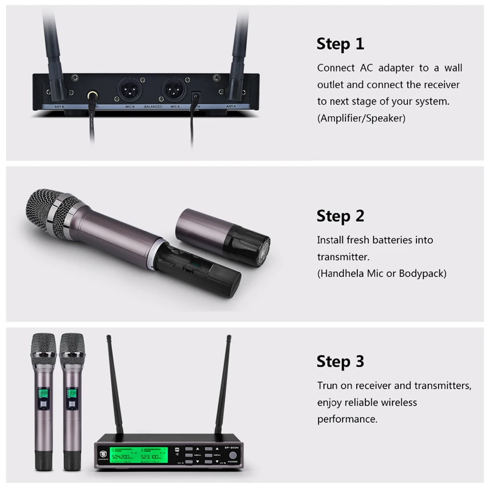 ⭐200 каналов регулируется, частота диапазона УВЧ 500-600 МГц, ⭐Передатчик: полностью металлические ручные микрофоны с функцией отключения звука ⭐Приемник: рабочий ЖК-экран, полностью металлическая коробка с многофункциональным ключом ⭐16 уровней эхо и 16 уровней эквалайзера на выбор ⭐Диапазон: до 300 футов (до 100 метров), подходит для шоу, выступлений, вечерние, караоке, церкви, сцены и т. Д. ⭐Аккумулятор: требуется 4*1,5 АА (не входит в посылка из-за ограничения доставки)