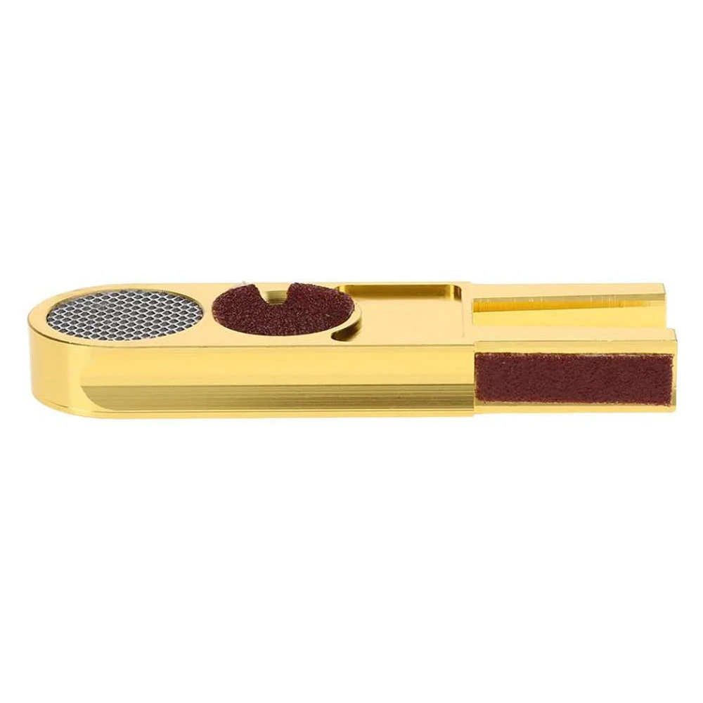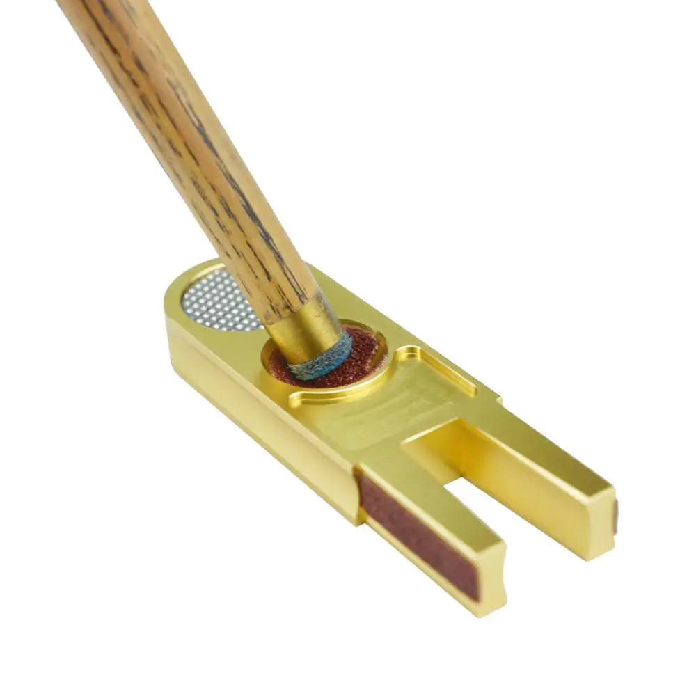 > Многофункциональный, может быть использован как tapper, dime shaper, никелевый shaper, триммер и полировщик. > U-образной бильярдный кий наконечником scuffer полировальник, 5-в-1 Инструмент может использоваться как резьбонарезной станок, цента сторона стайлера, не содержит никель сторона стайлера, машинка для стрижки и полировщик. Отличный аксессуар для вашего бильярдного бассейна слайдер для ухода за кием. > Запасной наконечник с несколькими углами, размер кармана, чтобы поместиться в чехол для бильярдного кия. > Острые металлические зубы нажмите Мел на наконечник кия, а также может быть использован для потертости плохо застекленного наконечника. Размер: 8,2*2,5*1 см (3,23*0,99*0,39 дюймов) Вес: 30 г (1,06 унций)