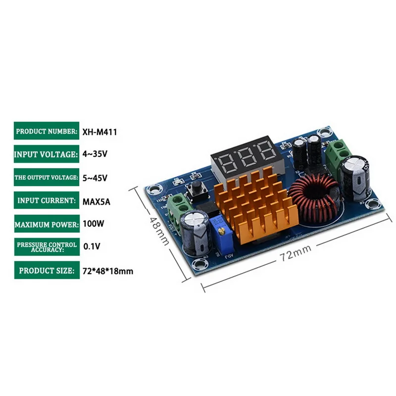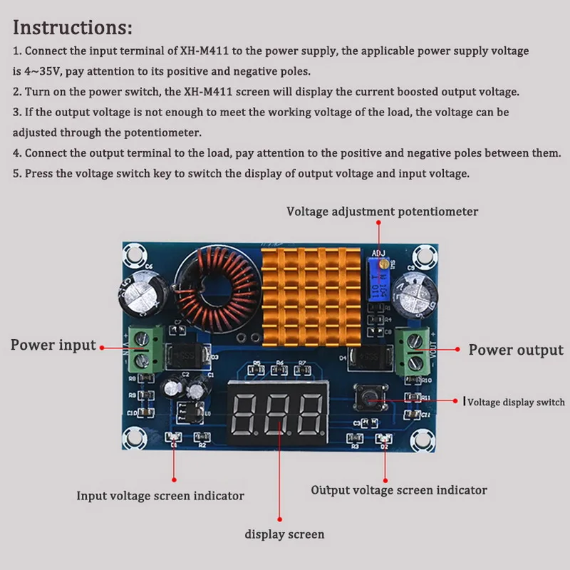 <Регулируемое напряжение: с потенциометром, выходное напряжение может быть отрегулировано, вы просто поворачиваетесь с помощью отвертки.
