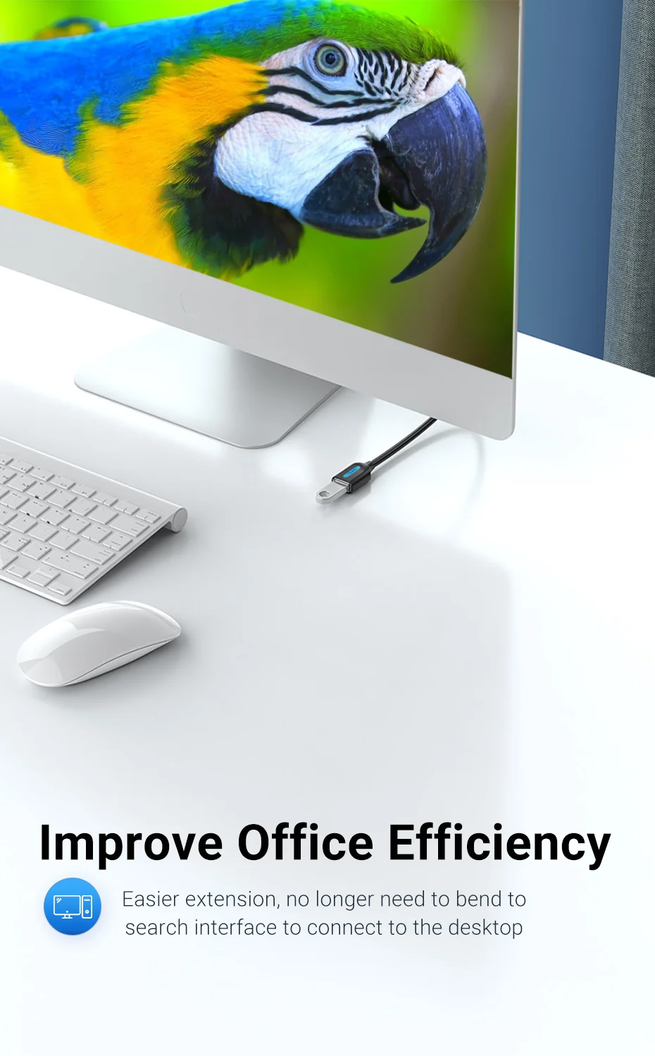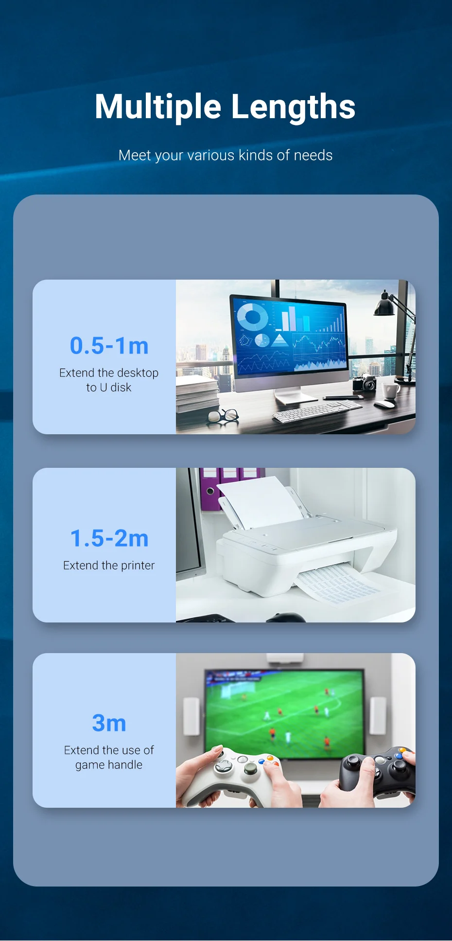 We have 0.5m/1m/1.5m/2m/3m five lengths for you to choose. It can be used in any situation perfectly. For example,0.5m-1m can be used to extend the desktop to U disk,1.5m-2m can be used to extend the printer,3m can be used to extend the use of game handle.