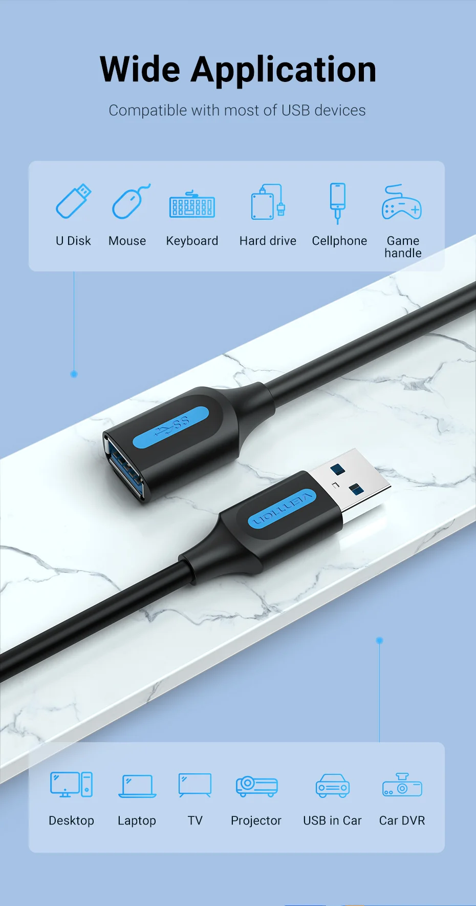 It compatible with laptop, mouse, keyboard, desktop, hard drive, U disk, cellphone, game handle, TV, USB in car and other devices. Expand USB to other devices in a simpler and cheaper way.