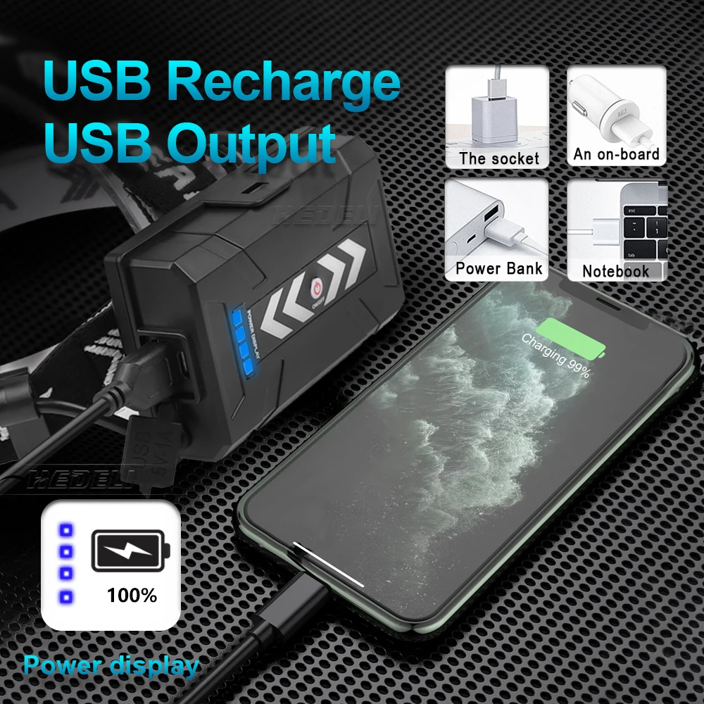 Предназначено для работы, правоохранительных органов, охоты, разведки, безопасности, рыбалки, поиска и спасенияИспользует новейший светодиодный индикатор XHP90.3 + cob для максимальной выходной мощности до 500000 люменовИмеет пиковую интенсивность луча 120000cd и расстояние броска до 1200 метровИзготовлен из авиационного алюминиевого сплава прочный HAIII военный класс Жесткий анодированныйИспользуйте перезаряжаемую батарею 3*18650, интеллектуальное управление схемой, емкость аккумулятора,Микро USB зарядка, 5 в USB выход может заряжать телефон4 режима (100% - 50% - SOS - COB)Угол наклона головы может регулироваться до 45 градусов.Красный индикатор светильник на держателе батареи играет хорошее предупреждение роль в ночное время ходьбы или Велосипеды!Водонепроницаемый в соответствии с IPX-6