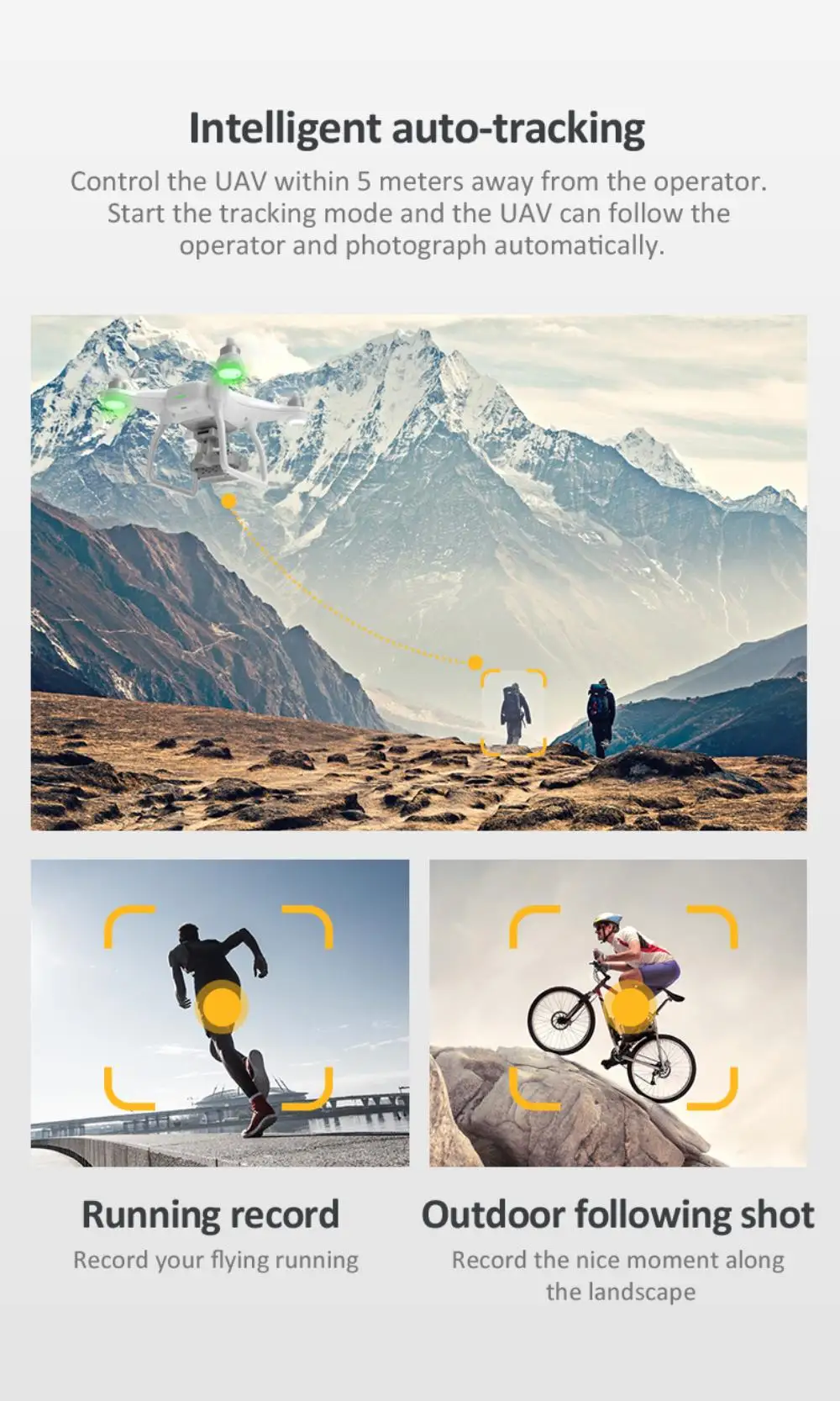- Режим следования за мной. Дрон будет автоматически следовать за вами и захватывает вас везде, где вы двигаетесь. Держать вас в кадре в любое время, легче получить сложные снимки, обеспечивает беспилотный полет и самообслуживания