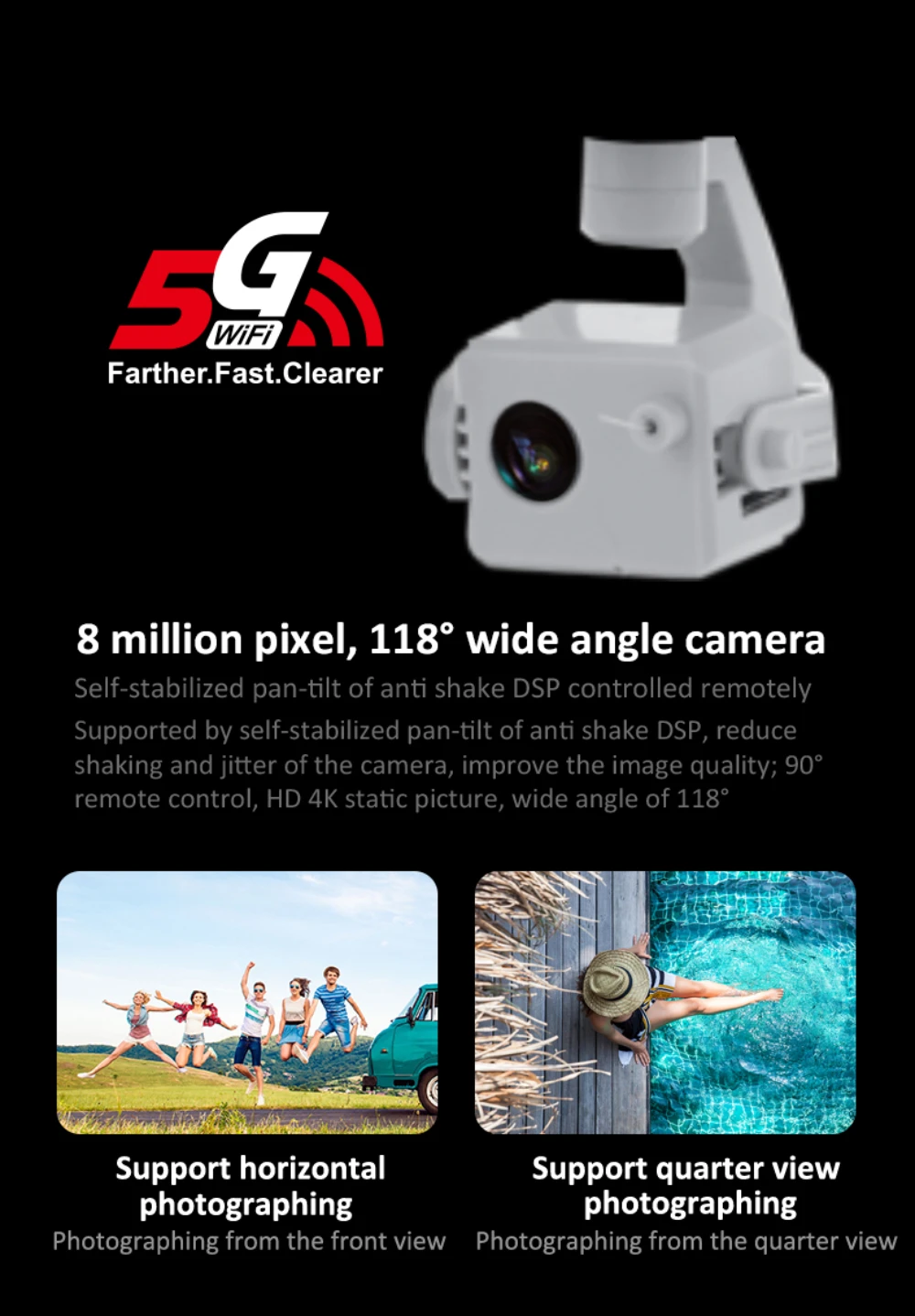 - 3-осевой Противоударная стабильный Gimbal: Оснащен сочетает в себе светильник Уайт 3-осевой механической gimbal с новейший профессиональный алгоритмы управления. Убедитесь, что камеры дрона обеспечивают высокое качество, уменьшая размытие, вызванное колебаниями во время полета.